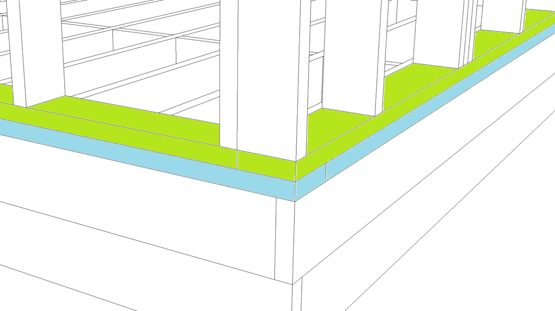 После завершения сборки каркаса нижнего перекрытия дачного одноэтажного дома 6х10: приступил к монтажу нижней обвязки стен. В моём проекте я применил двойную нижнюю обвязку стен, что не является обязательным элементом конструкции каркасного дома: Но так как я строю дом не по технологии "платформа", то каркасы стен устанавливаются не на черновой пол, а прямо на лаги каркаса перекрытия, и двойная нижняя обвязка потребовалась мне по двум причинам. Первая - возможность укладки демпферного слоя между нижним перекрытием и стенами. Этот слой снизит передачу ударных нагрузок между стенами и полом. В доме на сваях с каркасным нижним перекрытием, в отличие от плитного фундамента, ударные нагрузки (хлопанье дверьми и окнами, ходьба) распространяются по всему дому и приводят к вибрациям несущих конструкций, что может помешать тем, кто отдыхает. Опыт жизни в таких домах у меня достаточный для того, чтобы постараться снизить этот эффект в своём новом доме. Вторая - получение нужной высоты сплошного