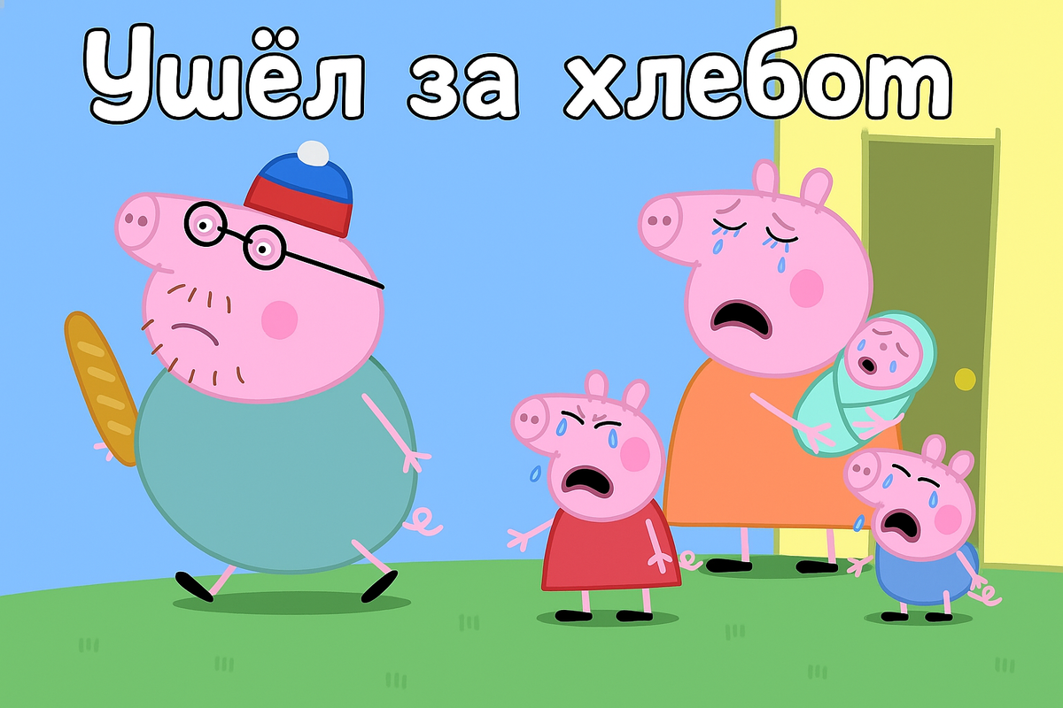 Всё началось с обычного дня… В солнечном доме на зелёном холме зазвучал привычный утренний хрюк. Папа Свин читал газету, Пеппа строила замок из кубиков, Джордж запускал динозавра в микроволновку (опять), а Мама Свинка с загадочной улыбкой держала в руках свёрток. — Это Эви, — сказала она с нежностью. — Наша третья доченька. Папа Свин посмотрел на неё. Потом — на Эви. Потом снова на неё. Газета задрожала в копытцах. Он почувствовал, как земля уходит из-под ног. В голове у него пронеслись сцены: три детских кресла в машине. Три кружки с молоком утром. Три ночных крика. И одна зарплата в магазине смешных очков, где он подрабатывает по выходным. — Я схожу за хлебом, — сказал Папа Свин. — Надолго. И вот начинается новая глава… Мама Свинка даже не удивилась. В России, как известно, это ритуал. Третий ребёнок — и мужчина исчезает, растворяется в пространстве, словно фантом. Его последний след — это пустой пакет из “Магнита” и оброненное “не забудь майонез”. Но у Папы Свина всё было иначе.