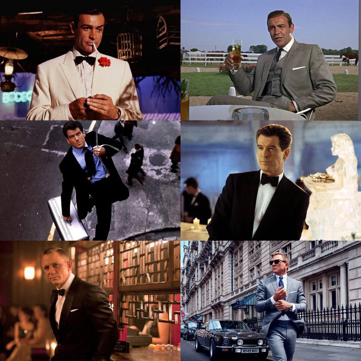 Стиль Джеймса Бонда — это уникальное сочетание классической английской сдержанности с функциональностью, необходимой секретному агенту. В ранних фильмах с Шоном Коннери мы видим выверенные пропорции костюмов с небольшими лацканами, умеренно зауженными брюками и характерной застежкой на двух пуговицах. Коннери создал образец британской элегантности: темно-синие и серые костюмы лаконичного кроя, уместные как в казино Монте-Карло, так и в офисе MI6. Особую роль играли детали — плотный узел галстука "Виндзор", белоснежные манжеты, выступающие на 1,5 см из рукава пиджака, и классические оксфорды. Достойны отдельного упоминания смокинги Бонда — всегда безупречные, с шалевым воротником, черной бабочкой и белой сорочкой с запонками. В эпоху Пирса Броснана стиль агента 007 адаптировался к эстетике 1990-х: силуэты стали более структурированными, с подчеркнутыми плечами и более выразительной талией. Костюмы от Brioni демонстрировали идеальный крой и фирменную итальянскую мягкость линий при сохран