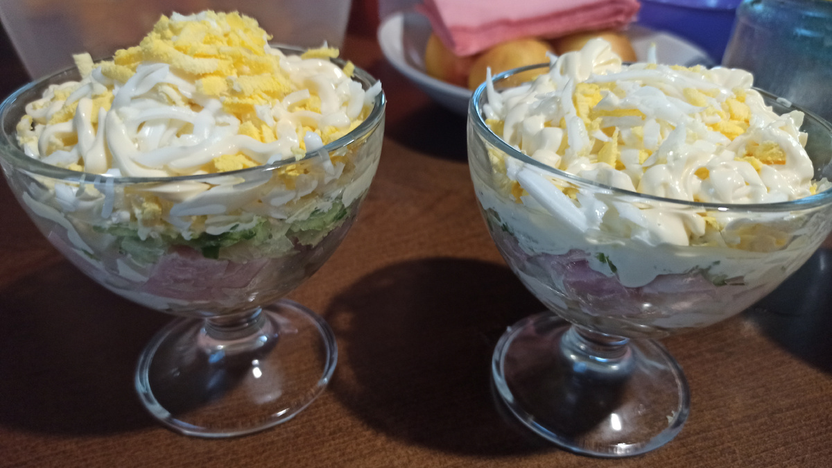 НЕЖНЫЙ ПРИ НЕЖНЫЙ САЛАТ, СОЧНЫЙ И ЛЕГКИЙ Готовлю такой салатик и порционно и большим салатником для большой компании. Этот салатик и так выглядит красиво, поэтому можно и не украшать его. Готовится он просто и быстро. Ингридиенты: Каждый слой промазываем майонезом, но я делаю проще, просто на мягкой упаковке нарезаю уголок и тонкой струйкой промазываю салат. Благодарю за внимание 🤗👍 и вкусных Вам рецептов 😋💜❤
