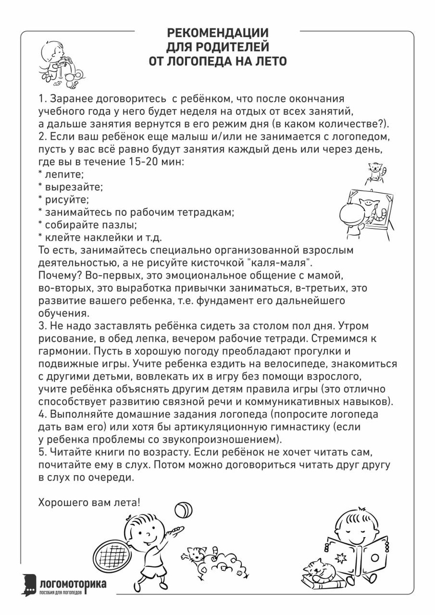 Рекомендации для родителей от логопеда на лето.