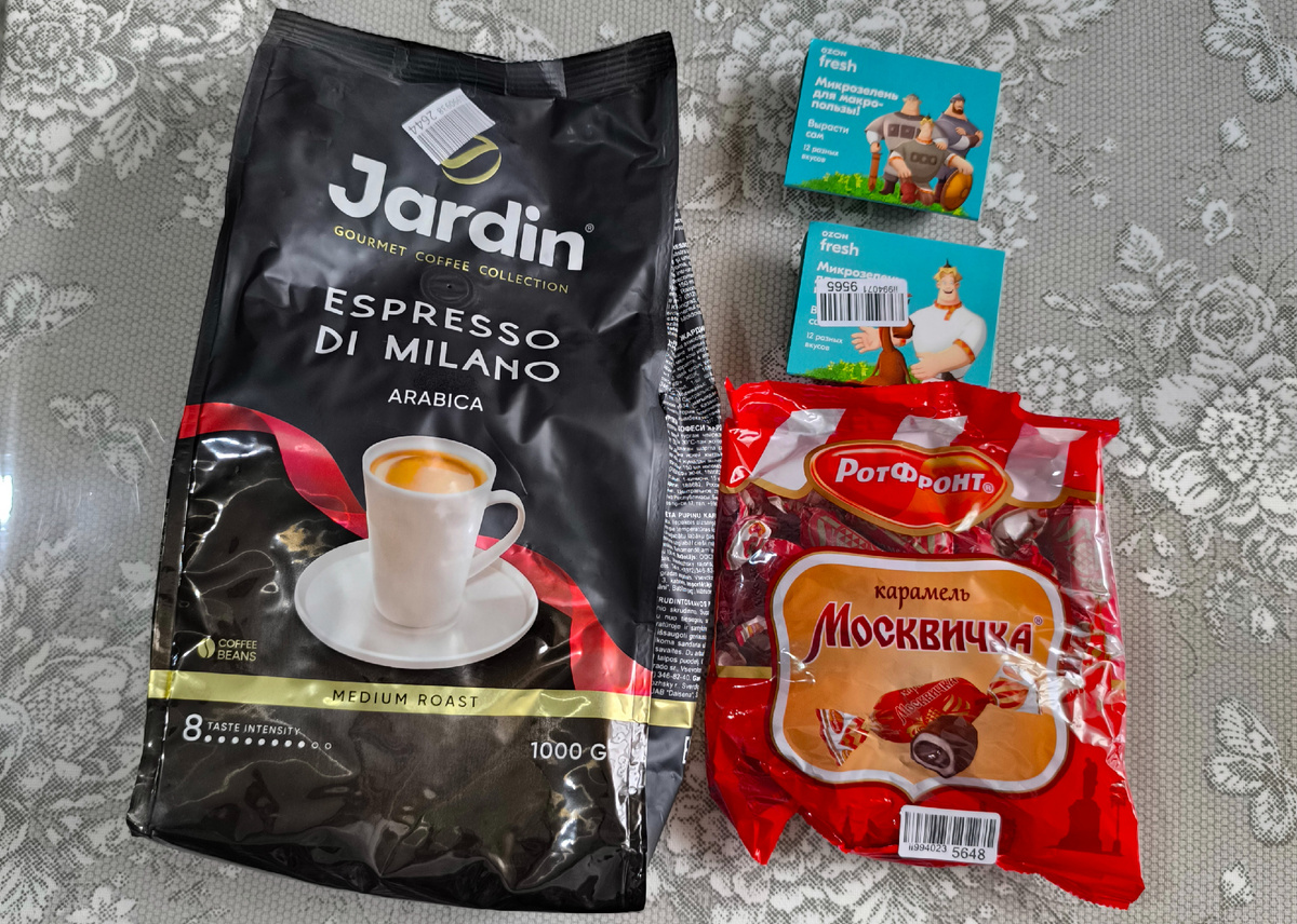 Озон постоянно придумывает интересные акции в которых я с удовольствием участвую. В этот раз сеть решила нас приобщить к правильному питанию и восполнить дефициты витаминов и микроэлементов в организмах любимых покупателей. За каждые 1600 рублей дают махонькую коробочку микрозелени. Также можно ее получить за игру в приложении и покупку определённых товаров. Микрозелень дают не в готовом виде, а набором "Почувствуй себя садовником". Очень удачный вариант. Можно со своими детками заняться этим увлекательным занятием. Мне идея понравилась! Но так как из меня агроном тот еще, отдаю эти пачки дочке, обещала поделиться результатом. В этом месяце покупок было не много, но денег потрачено не мало. Приобретала только самое необходимое, ни шага влево. Покупка #1. Аромат у кофе просто бомба, брала в запас, в этом месяце Озон дает хорошие скидки на Жардин. Карамель Москвичка любовь с самого детства и главное пока вроде не испортили. Многие конфеты теперь есть не могу. Ну это и к лучшему, здор