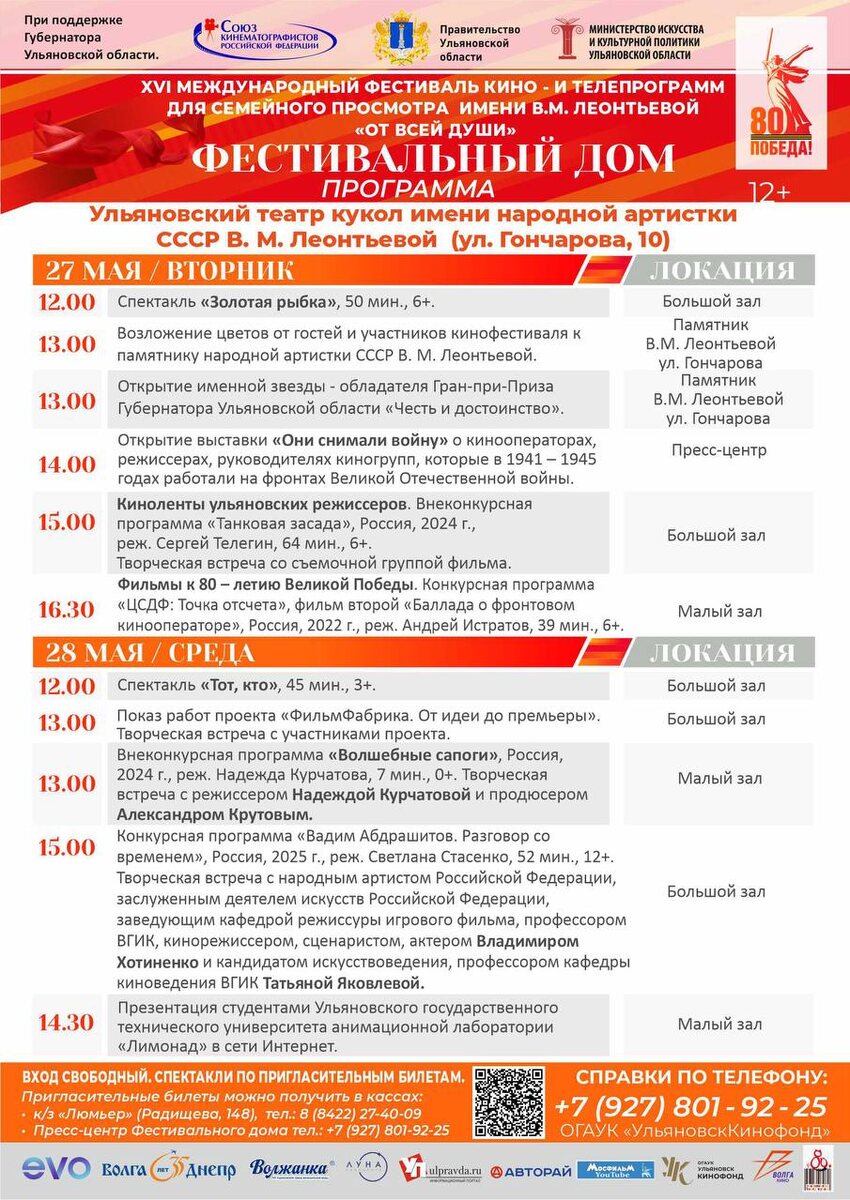 Уже завтра начинает свою работу Фестивальный дом XVI Международного фестиваля кино и телепрограмм для семейного просмотра имени В.М. Леонтьевой «От всей души» 🗓️ 27-31 мая 📍Гончарова, 10, Ульяновский театр кукол имени народной артистки СССР В. М. Леонтьевой 🏷️ вход свободный, а на спектакли по пригласительным билетам. Справки по тел.: 89278019225 #отвсейдуши2025