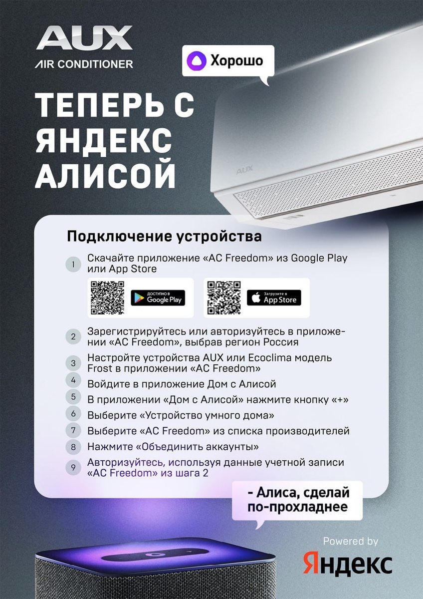AUX и Ecoclima теперь дружат с умным домом Алиса 💜 🔵AUX: Вся линейка сплит, мульти сплит и полупромышленных систем AUX, у которых Wi-Fi идет в комплекте и опционально. 🔵Ecoclima: Модельный ряд Frost line On-Off и Frost line Inverter. Пошаговую инструкцию по подключению устройства к «Дому с Алисой» через приложение АС Freedom смотрите на изображении.