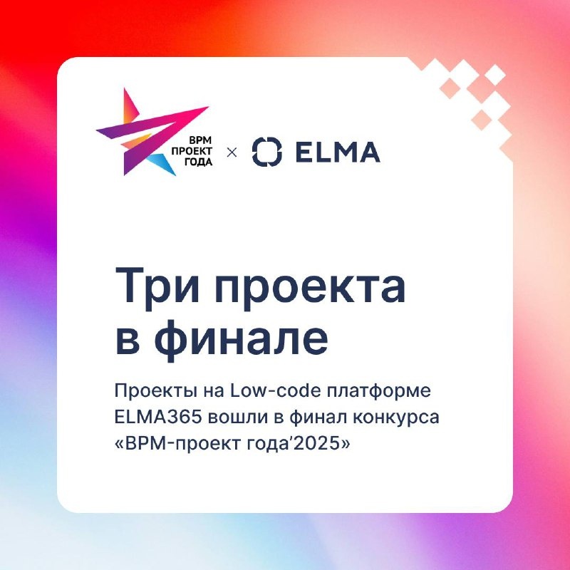 🔥 Три проекта на ELMA365 — в финале «BPM-проекта года 2025» Сразу три проекта, реализованных на платформе ELMA365, вошли в шорт-лист: ➡️ Анкер-Индастри — система онлайн-мониторинга производства с интеграцией станков, промышленными датчиками и OEE-аналитикой. ➡️ АСПЕКТ Лизинг — цифровая трансформация лизинговой компании: автоматизация лизингового конвейера, корпоративный портал и внешние интеграции. ➡️ Столото — масштабный перезапуск методологии процессного управления с автоматизацией управления изменениями. Победителей объявят 30 мая на итоговой конференции в Москве при поддержке ABPMP, Сколково и Правительства РФ. Участие бесплатное, регистрация открыта на сайте конкурса.