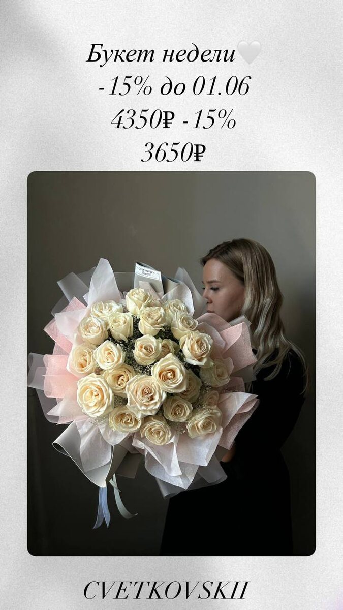 Букет недели из белых роз ! Только до 01.06 мая дарим скидку - 15% на букет недели специально для вас! Обычная цена из 25 шт – 4350₽, сейчас – 3650₽ Быстрая доставка по городу Успейте заказать! Как заказать? - Написать нам по номеру : 8(903)-652-93-98 - Самовывоз: Московский проспект, 90А