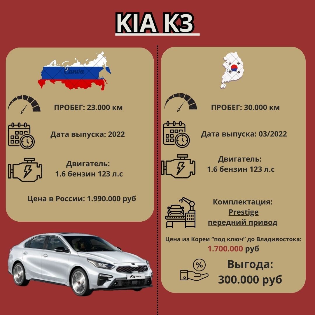 Сегодня в рубрике #Что_по_ценам? бюджетный кореец - Kia K3 или как в РФ привыкли, Kia Cerato Сравниваем стоимость автомобиля в России и при заказе через нас из Южной Кореи. 🇷🇺 Рынок РФ - объявление 🔵 Год: 2022 🔵 Пробег: 23 000 км 🔵 Цена: 1 990 000 ₽ 🇰🇷 Прямая поставка из Кореи - объявление 🔵 Год: 03.2022 🔵 Пробег: 30 000 км 🔵 Цена "под ключ" до Владивостока: 1 700 000 ₽ ⚡️ Выгода: 300 000 ₽ Что входит в цену из Кореи: ✅ Сам автомобиль ✅Осмотр и переоформление ✅Логистика до Владивостока ✅ Таможенное оформление и утилизационный сбор 📦 Машина доступна к покупке уже сейчас. Если продана — найдём аналог с таким же пробегом и комплектацией. 📍 Доставим авто в любой регион РФ. Пишите мне: @src_manager