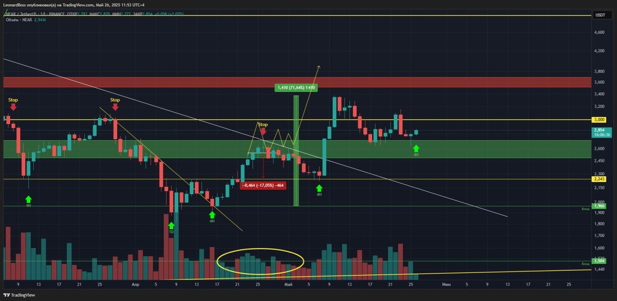 В ответ на пост #NEAR 🕯🕯🕯 ⚠️Для примера текущей ситуации по альтам, посмотрите, как отрабатывает блок поддержки! Идеальный повторный ретест блока поддержки, прямо сейчас отличная среднесрочная ТВХ с не менее эффективным стопом, по отношению к вероятному профиту!! P.s. исторически, зона уровня 3$, вплоть до 3,5$, является весьма сильной при движении в обе стороны, поэтому в данном случае, даже инвест позиция должна быть со стопом, если не хотите засесть в просадку на пару месяцев. В глобальном росте данного актива у меня нет сомнений, как не было и ранее!!!
