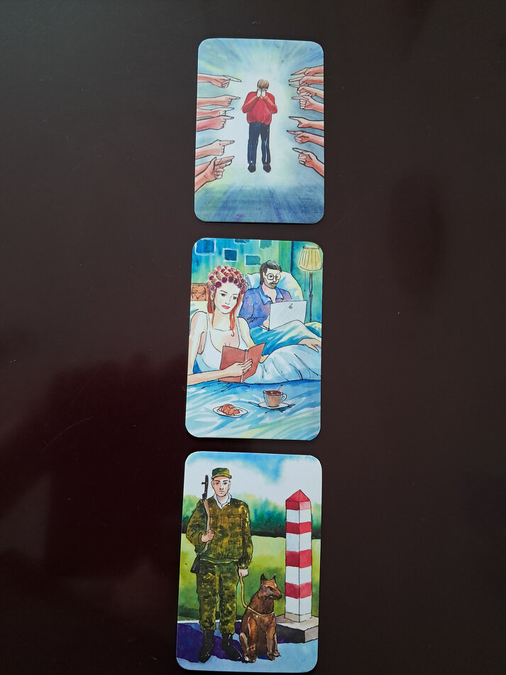 В терапии с клиенткой у нее возник запрос :"Я очень тревожусь что как будто бы не справляюсь с жизнью, детьми, проблемами, есть ощущение что у всех все хорошо, а у меня одной всегда есть какое-то "но", и я не знаю что с этим делать". Для обозначения проблемы и проработки, клиентке была предложена техника "Здесь и сейчас". (Михаил Ингерлейб Метафорические аасоциативные карты). 1. Клиентка задает себе вопрос: "Что сейчас тревожит меня больше всего?"- и вслепую достает из колоды три карты. Выкладывает в столбик перед собой. Я задала следующие вопросы клиентке:" Что на этих картинках характеризует тревожащую вас проблему, с новой или необычной стороны? И что является самым важным?". Ответ клиентки: " Я вижу что я боюсь осуждения, все будто смотрят на меня и ждут что я приму только верное решение. Отсутствующая общая связь с мужем, у нас нет общих интересов, и я будто одна на страже покоя, порядка. Но я так напряжена и будто не вижу просвета. Самым важным кажется то, что я как будто наедине