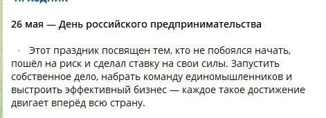 26 Мая - День российского предпринимателя. Поздравляю всех смелых и отважных, ибо только такие могут нести на себе этот груз ответственности. Но если подвести итоги, дело стоит того🎉. Вперёд! Вас ждёт много всего интересного, путь сквозь дебри будет непростым, но чем сложней он будет, тем лучше будет вознаграждение и его ценность🎁 .🎉 P.D. если кому-нибудь нужна моя консультация ( бесплатная) по вашему бизнесу, обращайтесь, у меня большой опыт в теме. Помогу чем смогу 😊