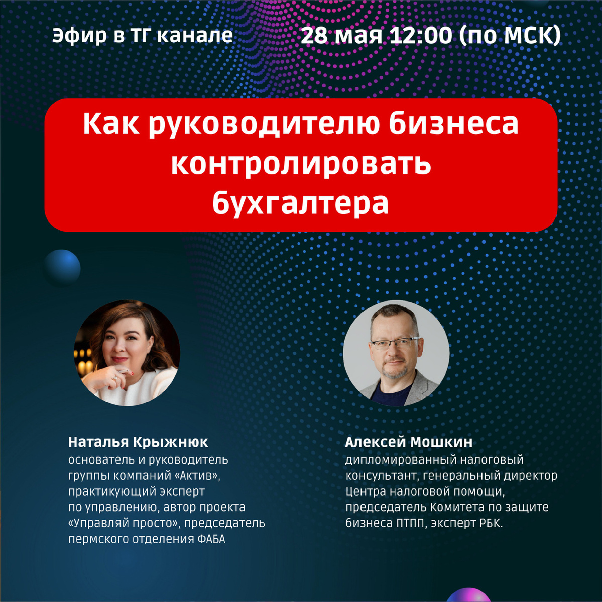 Предприниматели идут в бизнес не для того чтобы разбираться в дебете-кредите. Но одна ошибка бухгалтера — и вы уже в зоне риска: штрафы, блокировка счёта, доначисления. Как понять, что бухгалтер работает не на автомате, а действительно защищает ваши интересы? Как выстроить взаимодействие, в котором вы контролируете, но не превращаетесь в ревизора? А главное — как не дать себя обмануть, если «всё сдано, всё хорошо», но по факту всё не так? 28 мая в 12:00 МСК на бесплатном эфире разложим по полочкам: ✅Как выбирать бухгалтера, чтобы потом не пожалеть; ✅Как правильно организовать контроль: эффективно и без давления; ✅Какие ошибки бухгалтера чаще всего приводят к проверкам и убыткам; ✅И как вовремя заметить, что вам откровенно врут — на примерах из практики. Спикеры: 🔹 Наталья Крыжнюк — основатель и руководитель группы компаний «Актив», практикующий эксперт по управлению, автор проекта «Управляй просто», председатель пермского отделения ФАБА. 🔹 Алексей Мошкин — дипломированный налого