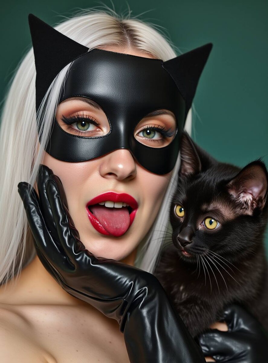 На фотографии изображена женщина в глянцевой маске кошки, держащая на руках черного котенка. Композиция и ракурс: • Портрет крупным планом - камера сфокусирована на лице модели, фиксируя как ее выразительную мимику, так и котенка. • Модель слегка приоткрывает рот, что придает фотографии игривости и выразительности. • Черный котенок прижат к ее лицу, его глаза устремлены в объектив, создавая интригующую визуальную ось. Изображение и детали: • Женщина с белоснежными волосами в черной кожаной маске с кошачьими ушками - аллюзия на образ Женщины—кошки. • Глянцевая черная перчатка элегантно касается ее лица, подчеркивая эстетику фетиш-стиля. • Кожа гладкая, матовая, макияж выразительный: акцент сделан на губы и ресницы. • Черный котенок идеально дополняет концепцию — с ярко-зелеными глазами и пушистой шерсткой. Фон и окружение: • Монохромный фон в приглушенных зеленых тонах подчеркивает персонажей в кадре. • Минимализм окружения делает изображение еще более выразительным. Освещение и настро