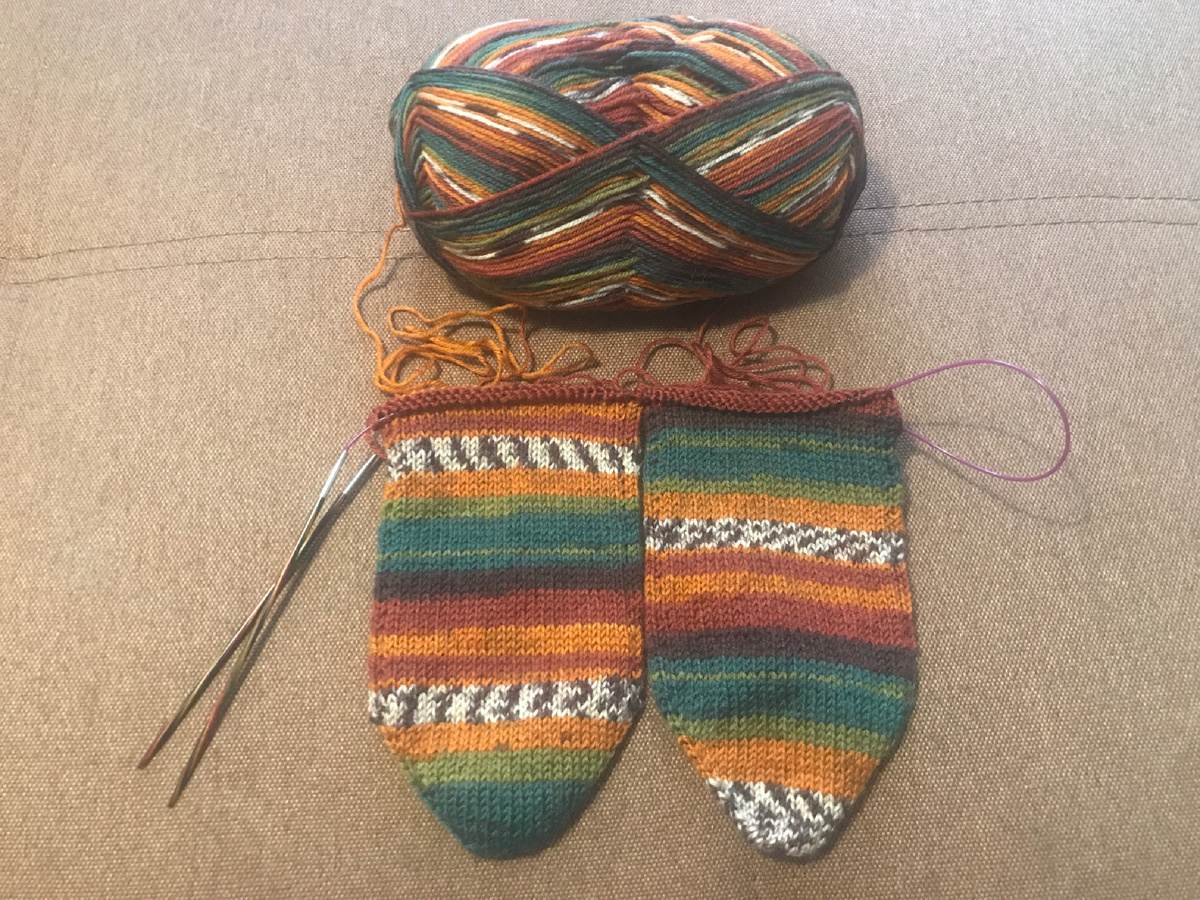 С удовольствием вяжу носочки. Подошла к клину подъема. 🤗 Работа продвигается медленно. Пряжи тонкая (Ализе Спервош, в 100г 420м), но такая приятная в работе, что я, похоже, начинаю в неё влюбляться. 🥰 Расцветка тоже очень радует, шикарно подобраны оттенки цветов, производителю большая и искренняя благодарность. Спицы номер два с половиной от Книт Про, серия Симфония. 😍 Березовые, дивным образом окрашенные в разные цвета спицы и яркая, пластичная леска. Вязать деревянными спицами - особое, ни с чем несравнимое удовольствие. 😊 Они ещё и тоненькие, будто тростиночки в руках держишь. Нет страха их сломать, но невольно работается особенно аккуратно этим ярким, веселым и греющим руки и душу инструментом. 🥰 Длина моих спиц 80см, для способа мэджик луп и моих рук - идеально. Вязала я носки и метровыми спицами, тоже удобно, но мне показалось, что больше времени уходит на перетягивание лески. Там, конечно, разница в доли секунды, но всё же. 😊 Говорят, что хорошие, качественные, дорогие с