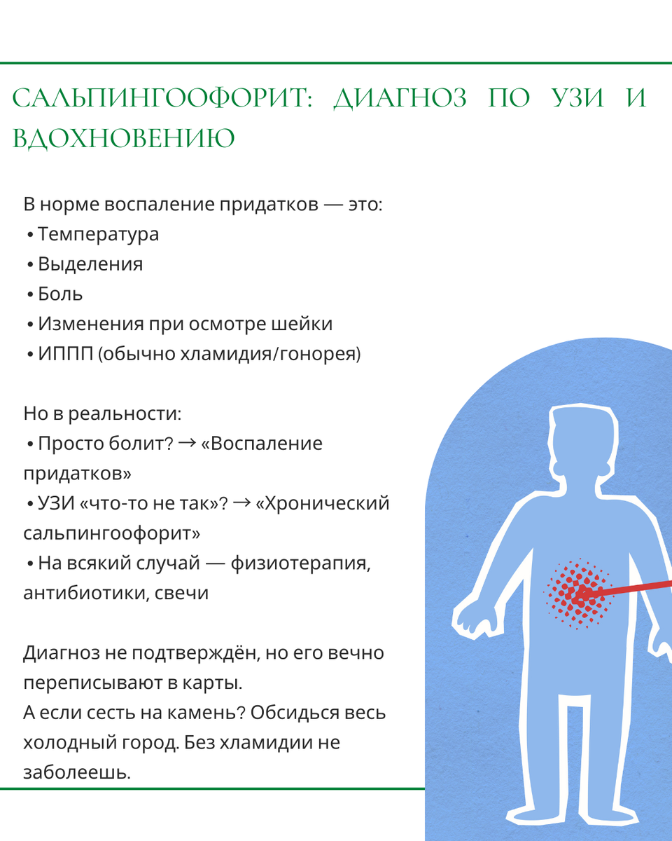 В наших краях всё, что однажды заболело — становится хроническим. Один раз в детстве ангина? Хронический тонзиллит на всю жизнь. Раз заболел живот? Хроническое воспаление придатков. Но в медицине есть определение: Хроническое воспаление — это рецидивирующее состояние, повторяющееся не реже 1 раза в 6 месяцев. Не «однажды что-то было» — а реальная динамика. “У вас хроническое…” — без анализа, без жалоб, без смысла У пациентки всё хорошо, но в карте 3 строки: