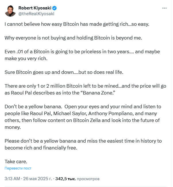 Не могу поверить, насколько просто разбогатеть с биткоином... просто невероятно. Почему все до сих пор не покупают и не хранят биткоин — для меня загадка. Даже 0,01 биткоина через два года может стать бесценным... и, возможно, сделает вас очень богатым. Да, биткоин поднимается и падает... но ведь и жизнь такая же. Осталось добыть всего 1–2 миллиона биткоинов… и цена, как описывает Рауль Пал, уйдёт в так называемую «банановую зону». Не будь «жёлтым бананом». Открой глаза и ум, послушай людей вроде Рауля Пала, Майкла Сэйлора, Энтони Помплиано и многих других, следи за контентом Bitcoin Zella и загляни в будущее денег. Пожалуйста, не будь «жёлтым бананом» и не упусти самый простой момент в истории, чтобы разбогатеть и обрести финансовую свободу. Береги себя.