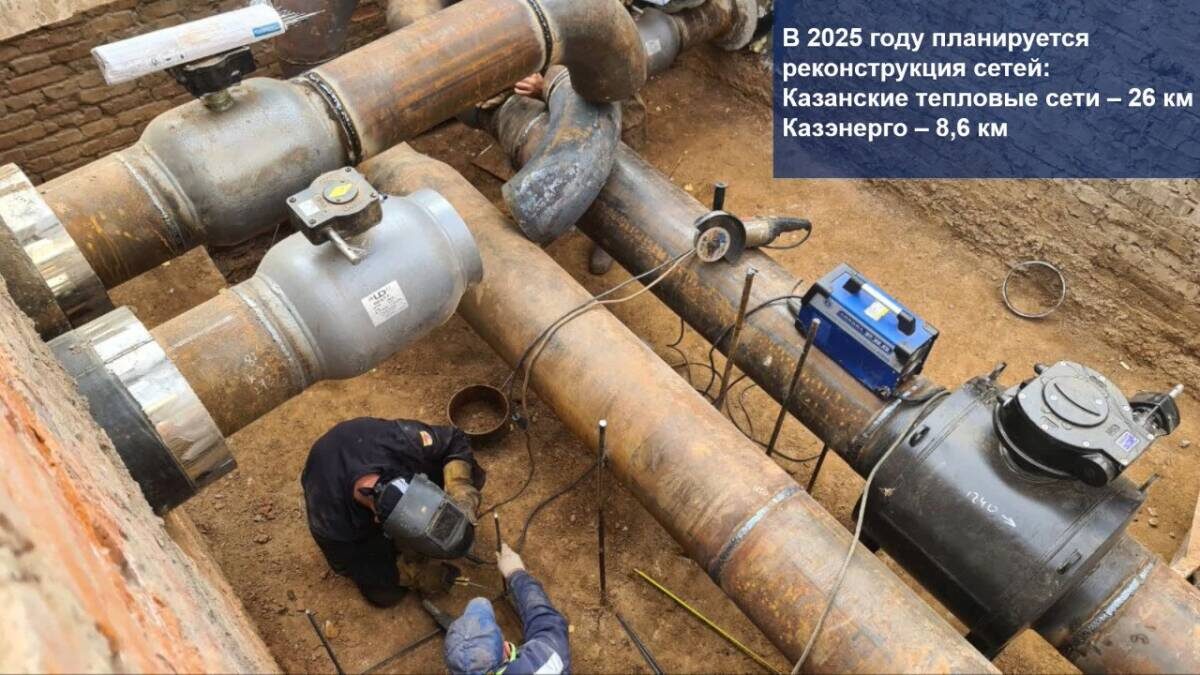Автор: Александра Давыдова В Казани в 2025 году планируют заменить 34,6 км тепловых и водопроводных сетей – это 4% от их общей протяженности. О планах рассказал замруководителя исполкома города Искандер Гиниятуллин на деловом понедельнике, подчеркнув, что это соответствует нормативам, к которым город стремился в последние годы. Кроме того, в городе продолжится строительство магистрального тепловода №5. В этом году в планах – 940 метров от ТЭЦ-1 до котельной «Горки». Он обеспечит теплом новостройки площадью почти 2 млн кв. м на улицах Аделя Кутуя и Даурской, а также десятки социальных объектов. На ремонт многоквартирных домов республики в текущем году выделено более 4 млрд рублей. В рамках этих средств утеплят фасады 22 многоквартирных домов, а в 46 домах заменят систему отопления. Гиниятуллин напомнил, что за последние годы в городе отремонтировали около 110 км сетей, однако еще 525 км нуждаются в замене. Модернизация тепловых сетей соответствует целям национального проекта «Инфраструк