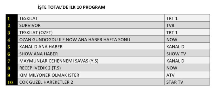 Вот и стали известны итоги телевизионных баталий за внимание зрителей в воскресенье, 25 мая 2025 года! 🔥 Редакция сайта cheek-look.ru внимательно изучила данные и готова раскрыть все карты: кто лидирует, кто дышит в спину и какие проекты неожиданно вырвались в топ. 😮 TRT1 снова доказал, что его флагманский сериал «Разведка» — не просто лидер, а настоящий телевизионный титан! В общей категории (Total) он занял первое место, а его же сокращённая версия («Разведка (özet)») замкнула тройку лидеров. Между ними вклинился «Survivor 2025 All Star – Gönüllüler» — видимо, зрителям всё ещё не надоело следить за борьбой на выживание. 🤔 В категории AB (ключевая аудитория) расклад почти идентичен: «Разведка» на первом месте, «Survivor» на втором, а вот третью позицию неожиданно занял «Kanal D Ana Haber» — видимо, новости в этот день были особенно острыми. 💥 В категории ABC (более широкая аудитория) «Разведка» снова рулит, за ней идёт «Survivor», а на третьем месте — «Ozan Gündoğdu ile Now Ana Ha