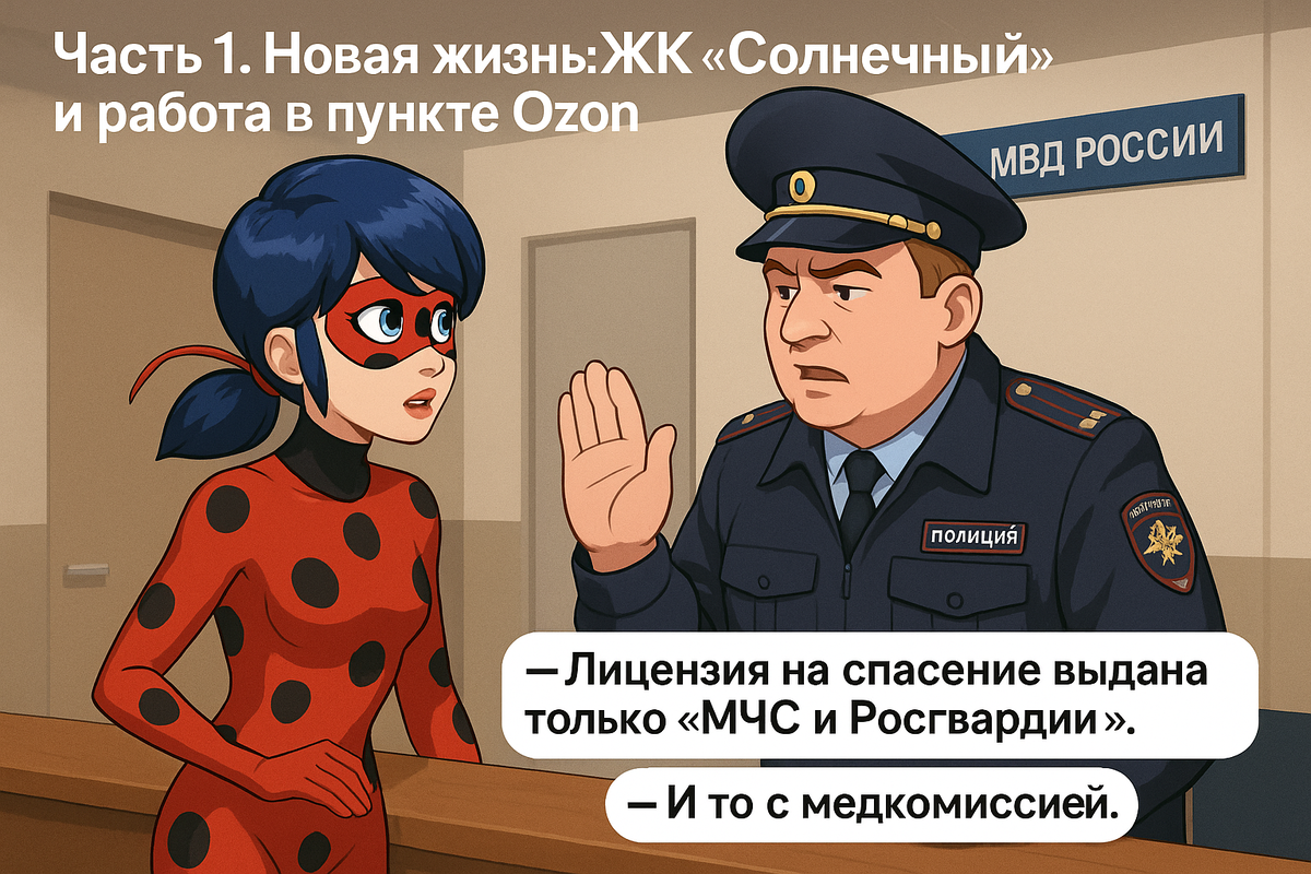 Маринетт Дюпен-Чен в обычной жизни не просыпалась в хостеле на Профсоюзной. Но именно туда её занесло после “странного сбоя в портале”. Адриан исчез в момент приземления. Плагг потерял ориентацию в пространстве. Тикки заявила: «Россия — это испытание. Даже для талисманов». Мир перестал быть прежним. Париж остался на экране загрузки, а на столе стоял доширак. ⸻ Часть 1. Новая жизнь: ЖК “Солнечный” и работа в пункте Ozon Первую неделю Маринетт пыталась быть Леди Баг. Но в местном участке МВД ей сказали: — Лицензия на спасение выдана только “МЧС и Росгвардии”. — И то с медкомиссией. Пришлось переквалифицироваться. Теперь она принимала заказы в пункте Ozon на первом этаже “Солнечного”. Адриана так и не было. Хотя один раз курьер принёс заказ на имя “Агресс”. Маринетт чуть не расплакалась. Это был Power Bank и лапша “Роллтон”. Часть 2. Плагг подсел на российский сыр Пока Маринетт страдала, Плагг нашёл себя. — Я не хочу обратно, — заявил он однажды. — У вас тут… сулугуни. Плагг влюбился