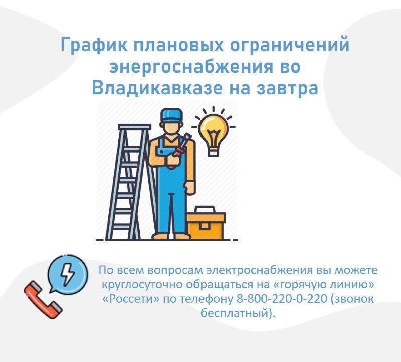 Во Владикавказе запланированы отключения электроэнергии с 10:00 до 16:00 26 мая 2025 года по адресам ул. Весенняя, 15, 19, 19а, А. Кесаева, 37, 37/2. Это необходимо для обеспечения надежности энергоснабжения. За дополнительной информацией обращайтесь по телефону горячей линии «Россети» 8-800-220-0-220.