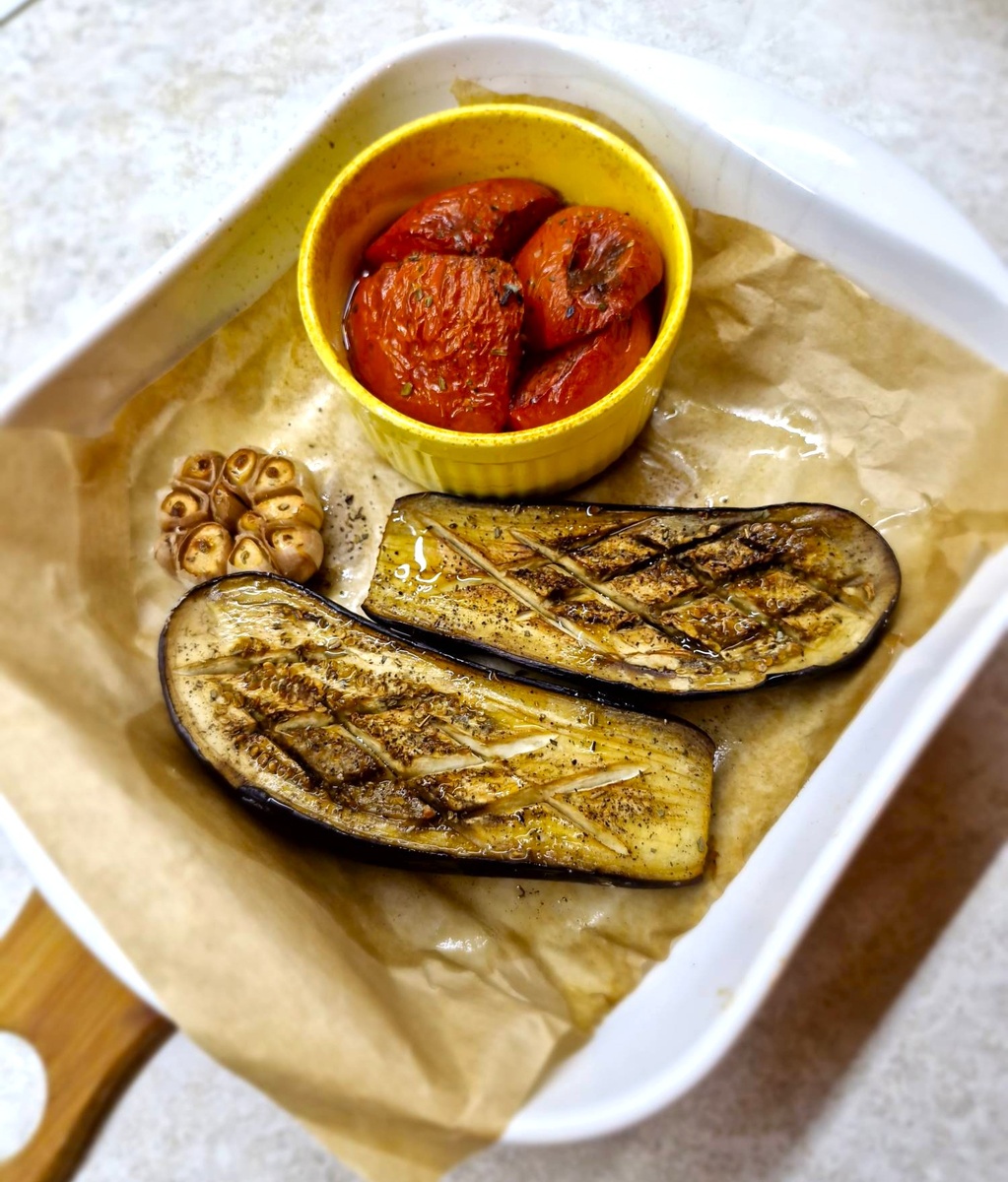 Про мою любовь к баклажанам вы уже слышали, а еще очень уж я люблю рецепты без лишнего шаманизма на кухне. Когда хочется чего-то вкусного на перекус, но времени и желания возиться с готовкой нет, меня выручает рецепт намазки из запеченного баклажана. Минимум ингредиентов, максимум пользы! Такая намазка идеально подходит для бутербродов, тостов и хлебцев. А еще она прекрасно сочетается с мясом и рыбой. Баклажан моем, отрезаем хвостик, разрезаем пополам и делаем надрезы крест на крест. Помидор моем и нарезаем на 3-4 части. У чеснока срезаем верхушку. Форму для выпечки застилаем пергаментом, выкладываем на него баклажан и чеснок. Помидор помещаем в отдельную чашечку или формочку для запекания. Всё солим, перчим, сбрызгиваем маслом и посыпаем специями, у меня паприка, красный перец, итальянские травы. Отправляем форму с овощами в разогретую до 180 градусов духовку на 30-40 минут и занимаемся своими делами. По истечении времени достаем запеченные овощи из духовки и даем немного остыть. За