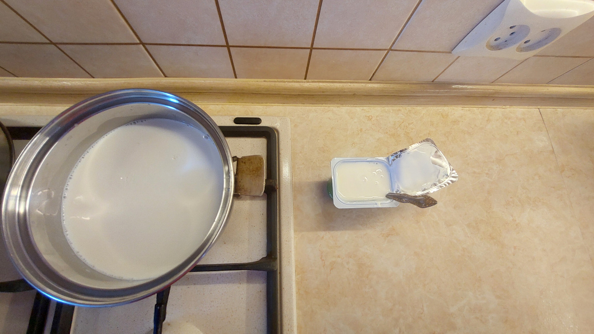 Когда мы приобрели мультиварку, я обратила внимание на режим Йогурт. А еще у меня есть специальный гаджет- йогуртница. Один раз у меня в ней получился вкусный йогурт , но потом почему- то он не удавался, получался очень кислый. Вот я решила еще раз попробовать, но только в мультиварке. Начала искать рецепты и нашла такой, в котором вообще никакой прибор не требовался. Вот что необходимо: 1 литр молока (я брала молоко длительного хранения, оно не требует кипячения) 1 баночка йогурта Активия без добавок Духовка, разогретая до 40-50 градусов Йогрут необходимо размешать молоком до жидкого состояния. Молоко подогреть до 38-40 градусов (я взяла обычный термометр и измеряла температуру им). После, в разогретое молоко, добавить размешенную до однородности активию и все хорошо перемешать. Далее молоко необходимо перелить или по баночкам, или в одну большую банку. Я вообще оставила все в кастрюле. Итак, молоко с закваской помещаем в разгоретую духовку (после разогрева духовку нужно выключить), с