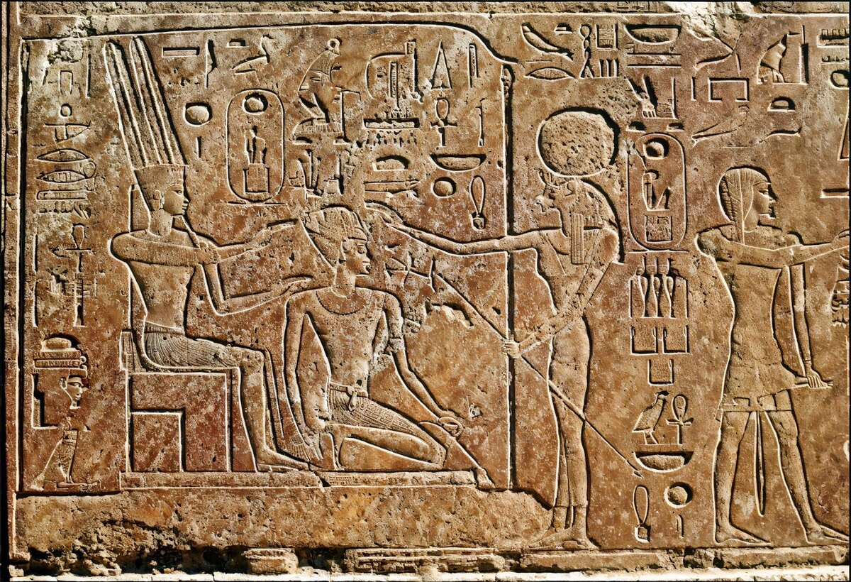 Царица Хатшепсут (в центре), предшественница и мачеха Тутмоса III, преклоняет колени перед Амоном-Ра (слева), чтобы получить благословение на этом рельефе в храме Амона-Ра в Карнаке, Египет. Скала, Флоренция