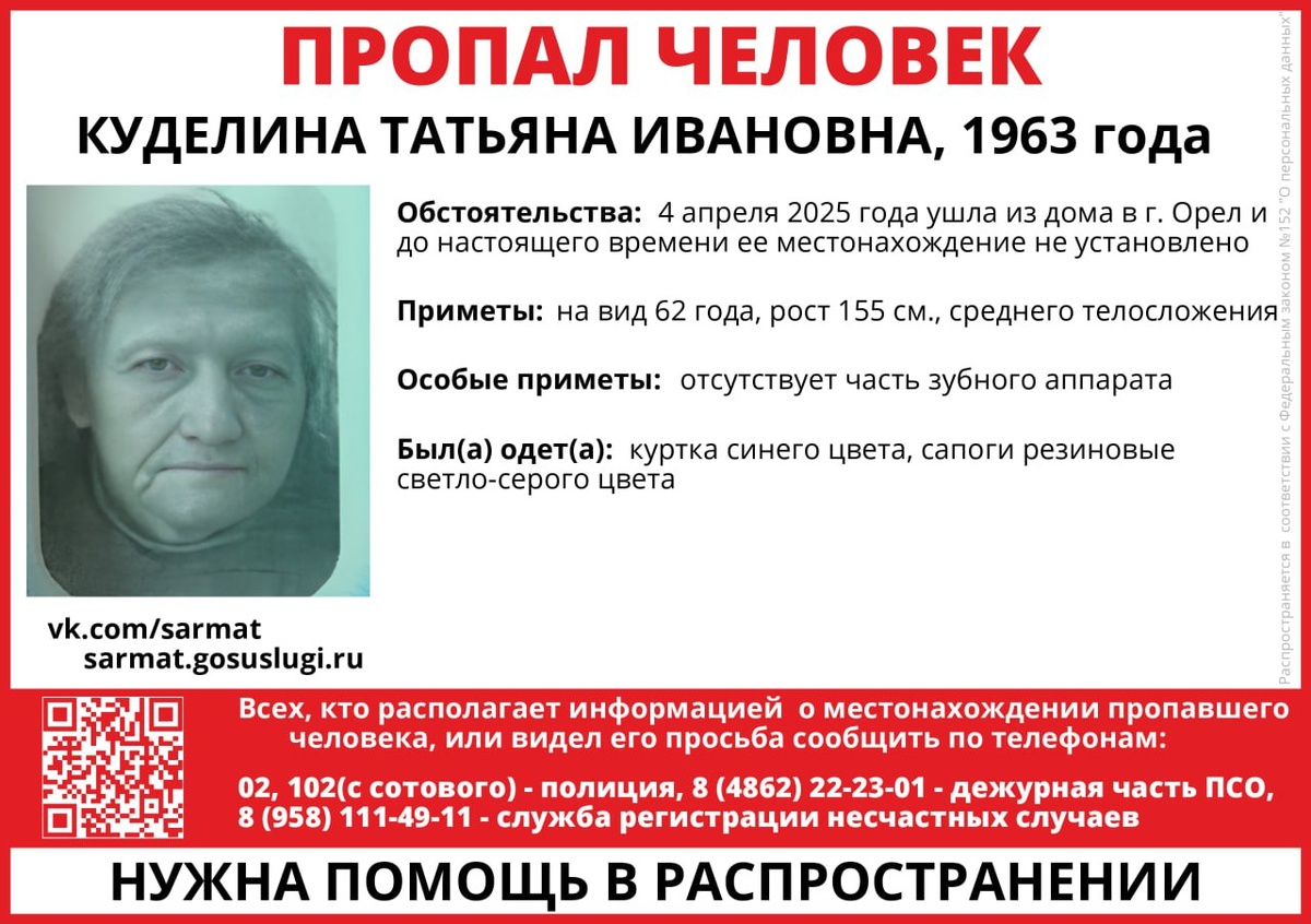 Службой регистрации несчастных случаев Орловской области устанавливается местонахождение пропавшей Куделиной Татьяны Ивановны 21.08.1963 года рождения, которая 4 апреля 2025 года ушла из дома в г. Орел и до настоящего времени ее местонахождение не установлено Приметы: на вид 62 года, рост 155 см., среднего телосложения Особые приметы: отсутствует часть зубного аппарата Была одета: куртка синего цвета, сапоги резиновые светло-серого цвета В связи с вышеизложенным, кто располагает информацией о местонахождении пропавшей, или видел ее, просим сообщить по телефонам: Полиция: 8 (4862) 43-32-32, 02 или 102 (с сотового) Дежурные службы поисково-спасательного отряда: 8 (4862) 222-301