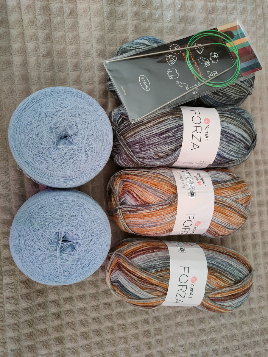 Планирую связать кардиган из носочной Форзы двух вариантов (состав: классическая носочная смесовка) и для отделки беру гребенной 100% меринос голубого цвета (1500 м в 100 г) в пять нитей. "Пилить" буду на спицах 2,25 мм, что впрочем для меня не впервые. Надеюсь, что докупать Форзу не придется. Вот такой мой первый Цветочный калейдоскоп.