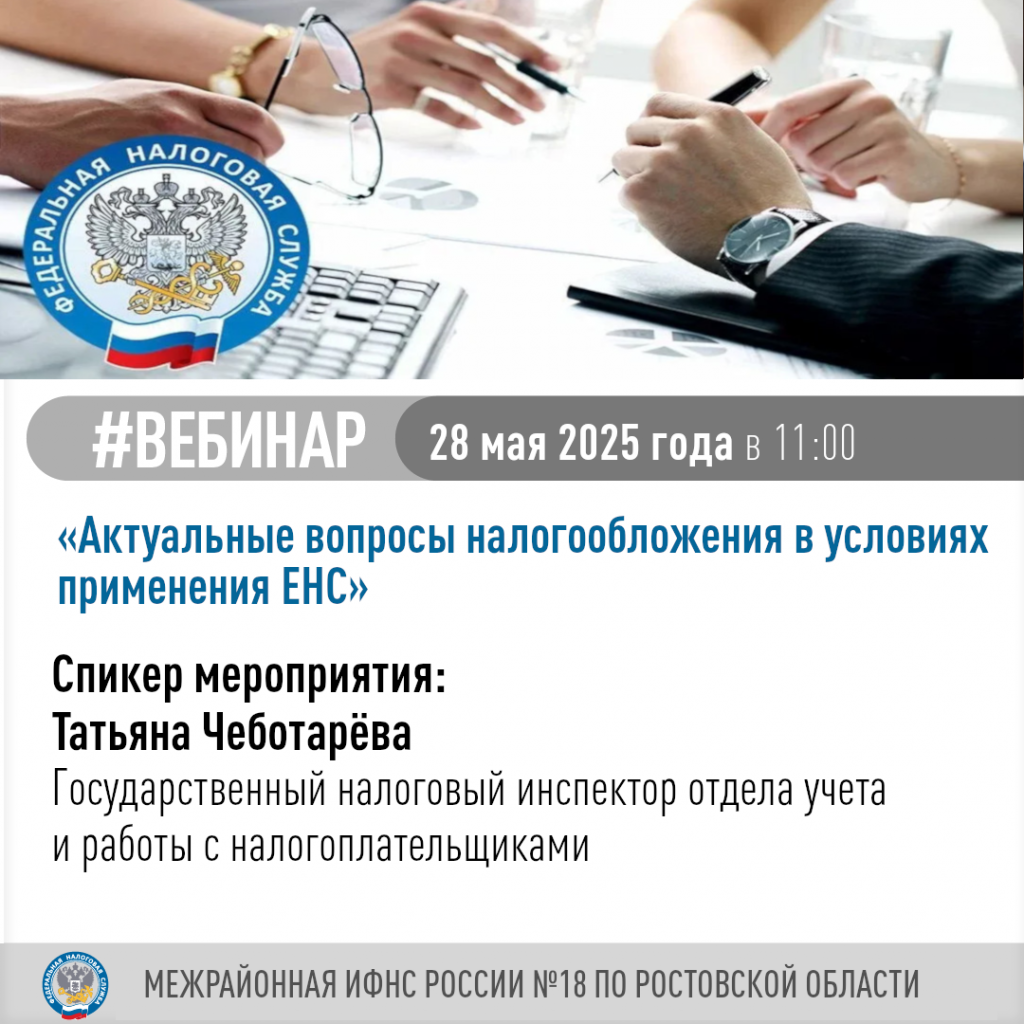 Приглашаем налогоплательщиков принять участие в вебинаре по теме «Актуальные вопросы налогообложения в условиях ЕНС». В программе вебинара: • Получение услуг ФНС России в электронном виде. Интернет-сервисы ФНС России. • Порядок получения квалифицированной электронной подписи. • Получение физическими лицами налоговых уведомлений и требований об уплате задолженности через личный кабинет на ЕПГУ. •Об СМС информировании о налоговой задолженности. Вебинар пройдет 28 мая 2025 года в 11:00. Для подключения к трансляции необходимо перейти по ссылке: https://clck.ru/3JpL9E Межрайонная ИФНС России № 18 по Ростовской области
