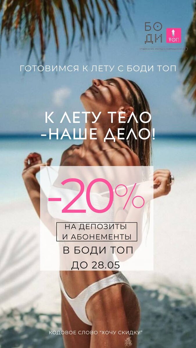 💥 ТОП-УСЛУГИ ОТ СЕТИ СТУДИЙ БОДИ ТОП ПО АКЦИИ -20%! 💥 🔥 УСПЕЙТЕ ЗАПИСАТЬСЯ ДО 28.05! 🔥 ✅ Все виды массажа: классический, лимфодренажный, антицеллюлитный, спортивный, расслабляющий + детский массаж ✅ Коррекция фигуры: обёртывания, аппаратные методики, моделирующие программы ✅ Лазерная эпиляция - гладкость на месяц! ✅ SPA-ритуалы: кедровая бочка, душ Шарко ✅ Профессиональная косметология 🎁 СКИДКА 20% на депозиты и абонементы! 📍 Адреса студий: • Химки - ул. Юннатов, 10 • Путилково - ул. Новотушинская, 2/3 • Путилково - ул. Просторная, 13 • Москва - ул. Муравская, 38к2 ⏰ Работаем ежедневно 10:00-21:00 📲 Онлайн-запись: [https://n960947.yclients.com Ваше тело скажет вам спасибо! 😍