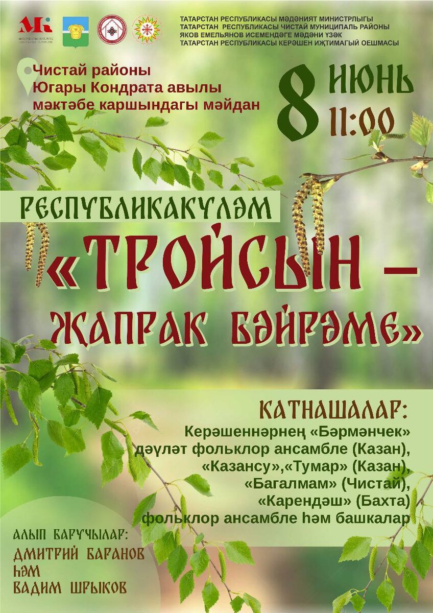 ☀Арулармысез, карендәшләр, дуслар, туганнар!☀ 🎡Сезне *8 июнь* дә Чистай районы Югары Кондрата авылында зурлап үткәреләчәк Республикакүләм *«Тройсын - җапрак бәйрәме»* нә чакырып калабыз🤗 Программада: 🔸Тройсын җолалары 🔹концерт-тамаша 🔸күңелле уеннар 🔹фотозона 🔸 балалар мәйданчыгы 🔹базар мәйданчыгы ⚡Чакырылган кунаклар арасында "Казансу", "Тумар" ансамбльләре (Казан), керәшеннәрнең "Бәрмәнчек" дәүләт фольклор ансамбльләре дә бар! Әлбәттә, Чистай районының данлыклы "Багалмам", "Карендәш" фольклор ансамбльләре дә бәйрәмнең асыл бизәге булачак! 🎤Бәйрәмне чын керәшен җегетләре - Дмитрий Баранов һәм Вадим Шрыков алып бара. 🤝🌻Бер күрешү - үзе бер гомер! Бәйрәмгә дусларыгызны, туганнарыгызны, танышларыгызны дәшегез! Чын безнеңчә, уйнап- көлеп, җыру әйтеп бергә гөрләшик әле!💃🤗 ☀ *Урыны:* Югары Кондрата авылы мәктәбе каршындагы мәйдан. ☀ *Вакыты:* 11:00 🎪Бәйрәмгә рәхим итегез! 🎪