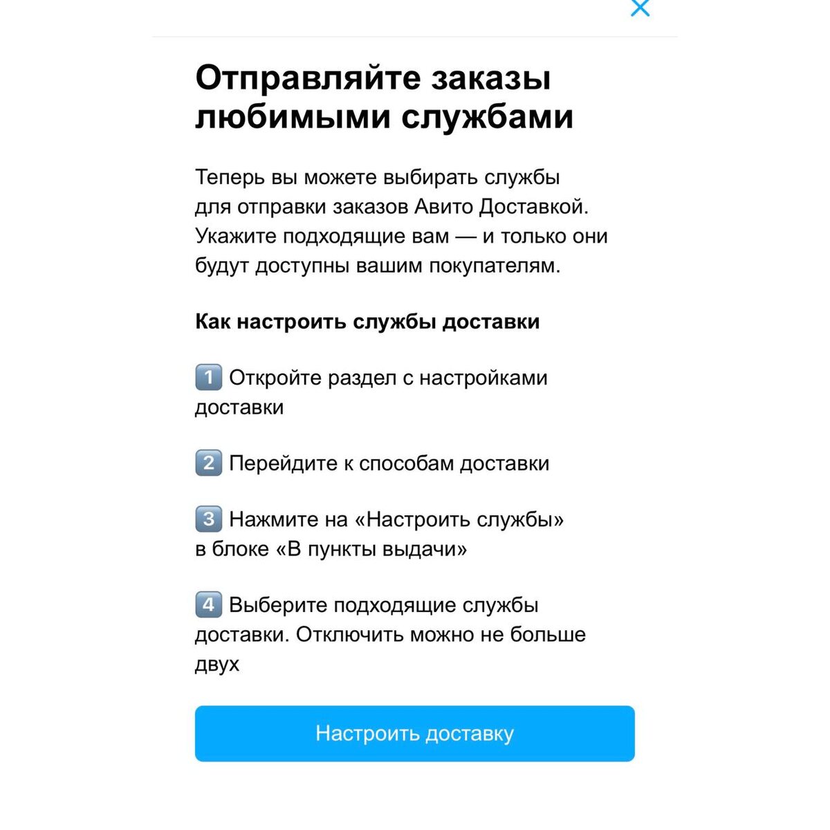 🔺Скоро ещё будет возможность отправлять из одного пункта Авито, независимо, какой службой заказа покупатель. А дальше логисты сами отправляют товар куда нужно. Правда, продавцу придется заплатить 20р за это удобство. Пока эта функция в разработке. Но думаю будет пользоваться популярностью.