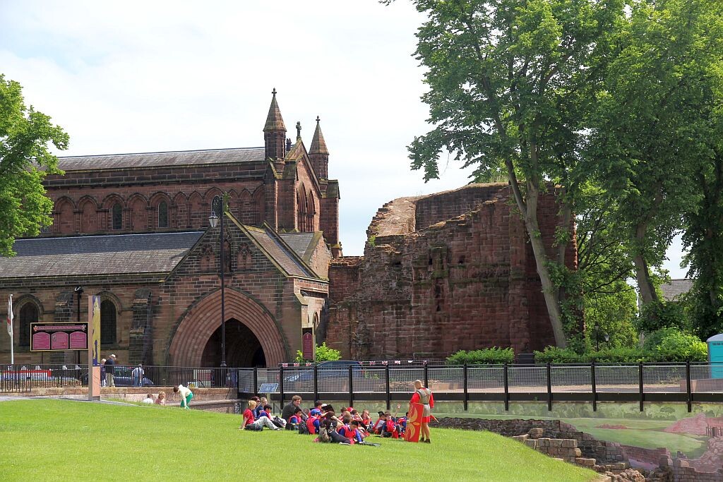 Римский город Честер, часть 1 На заднем плане амфитеатра мы видим церковь Святого Иоанна (St John the Baptist's Church), первый кафедральный собор города, заложенный в 7 в. за пределами городских стен (здесь материал амфитеатра, видимо, использовался особенно активно). Нынешнее здание датируется 11-12 вв. и является ярким представителем норманнской готики. C 1086 г. кафедра переехала в Ковентри, в 16 в. во время борьбы с монастырями было упразднено и аббатство, к тому моменту выросшее вокруг церкви. Во время правления королевы Елизаветы здесь располагался гарнизон, далее здание, как у нас после революции, исполняло разные функции, и в 19 в. по итогам проведенной реставрации ему был придан средневековый облик. Сейчас здание входит в National Heritage List - список национального достояния Великобритании. Здесь же рядом можно увидеть фундамент первых римских стен римского каструма