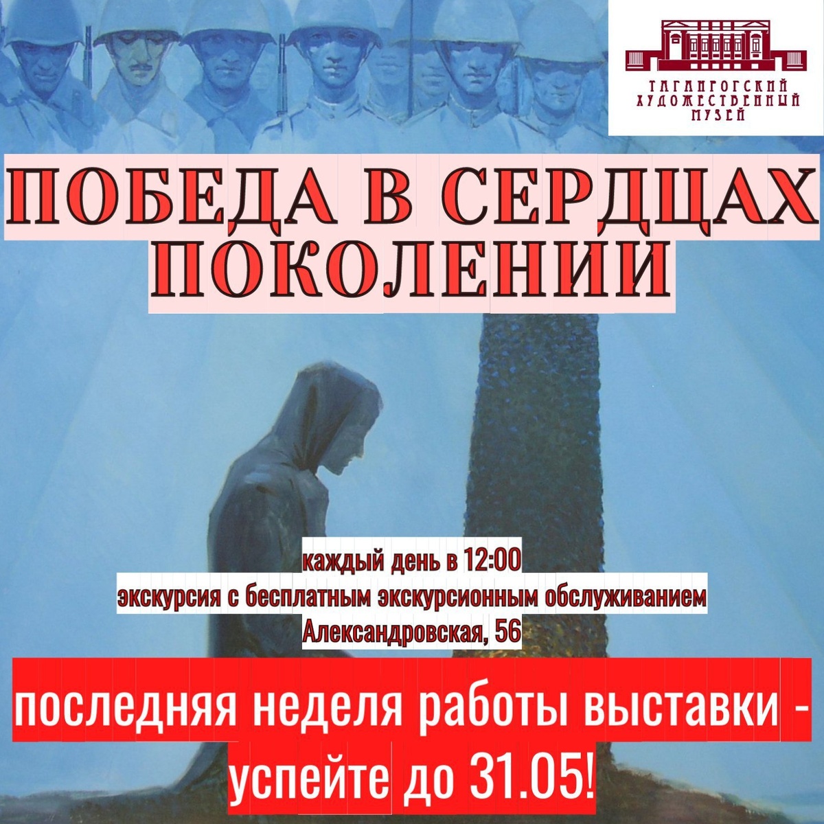 Дорогие жители и гости города! Осталась всего неделя, чтобы посетить уникальную выставку "Победа в сердцах поколений", посвящённую юбилею Великой Победы. Успейте записаться на экскурсию с бесплатным экскурсионным обслуживанием! #таганрогский_художественный_музей Александровская, 56. Телефон для справок: +7 (8634) 38-31-70. Сайт нашего музея, покупка билетов онлайн: https://clck.ru/3MH9t5