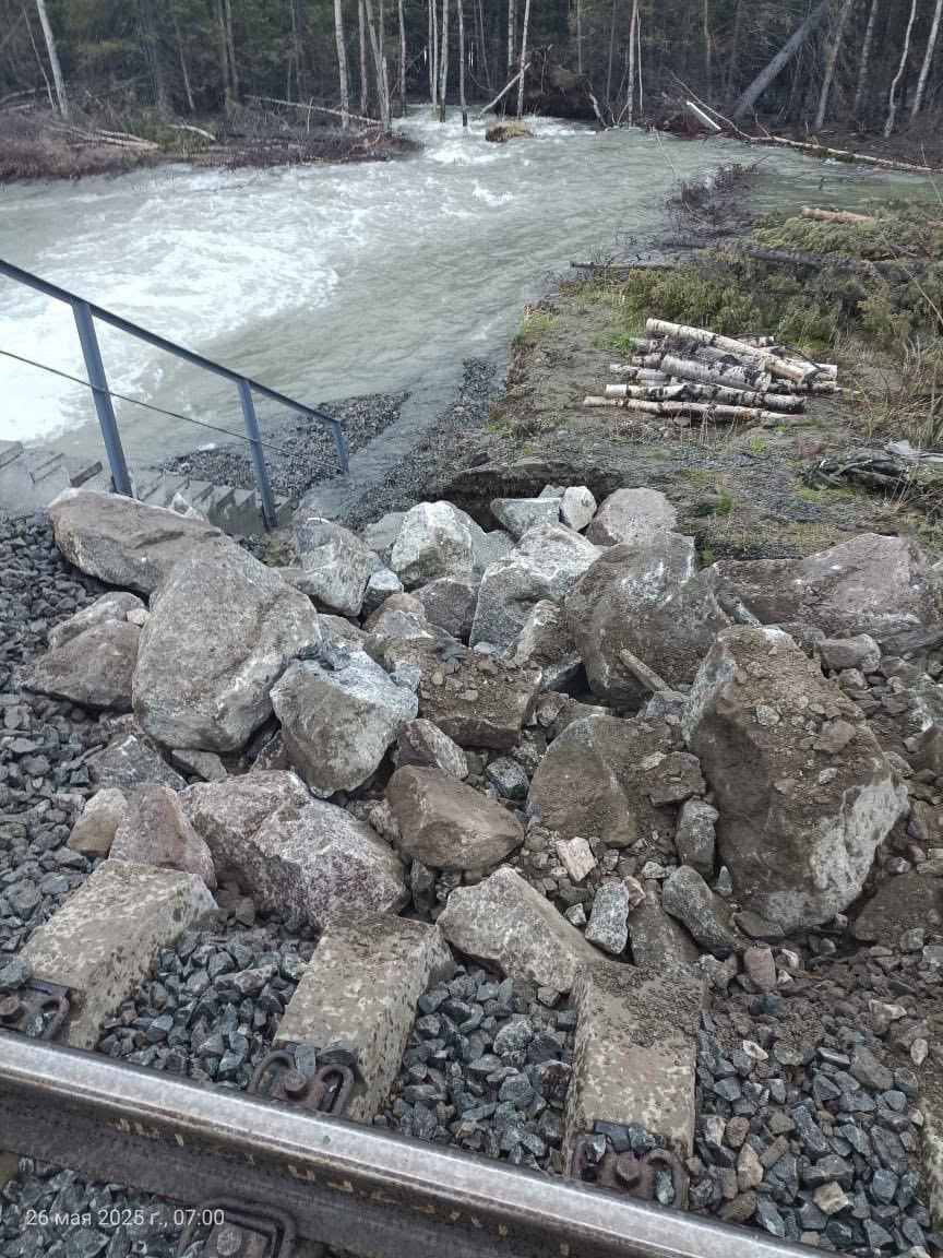 Организованы работы по подсыпке, уплотнению и укреплению грата. В результате ситуация стабилизировалась, напор воды спал, её уровень существенно снизился, угрозы для состояния полотна нет. Железнодорожниками проводятся работы по устранению последствий подмыва насыпи. Вблизи участка железнодорожного полотна водных объектов нет, угрозы для населения в настоящий момент нет.