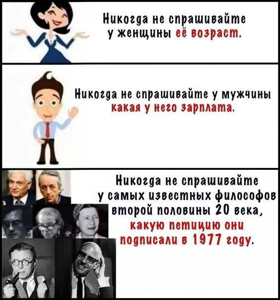 Постструктуралисты (и не только) против возраста согласия Есть довольно известный исторический анекдот про то, что французские интеллектуалы в 1977 году единым фронтом выступили за легализацию педофилии. Эту ситуацию и обыгрывает мем выше. На первый взгляд это выглядит очень некрасиво (на второй тоже, если честно), но всё-таки обстоятельства были несколько сложнее. Статья на Википедии, посвящённая этим событиям, так и называется – «Французские петиции против возраста согласия». С 1977 по 1979 таких петиций было несколько. Первая была опубликована в январе 1977 года и ряд авторов, включая Фуко, отказались её подписывать. Среди подписантов были Луи Арагон, Ролан Барт, Симона де Бовуар, Филипп Соллерс, Жиль Делёз, Феликс Гваттари, Жан-Поль Сартр, Жан-Франсуа Лиотар. Автор этой петиции долгое время был неизвестен, но в 2013 году Габриэль Мацнефф признался, что автором был он. Мацнефф неоднократно говорил, что имел связи различного характера с девочками школьного возраста. Одна из этих де