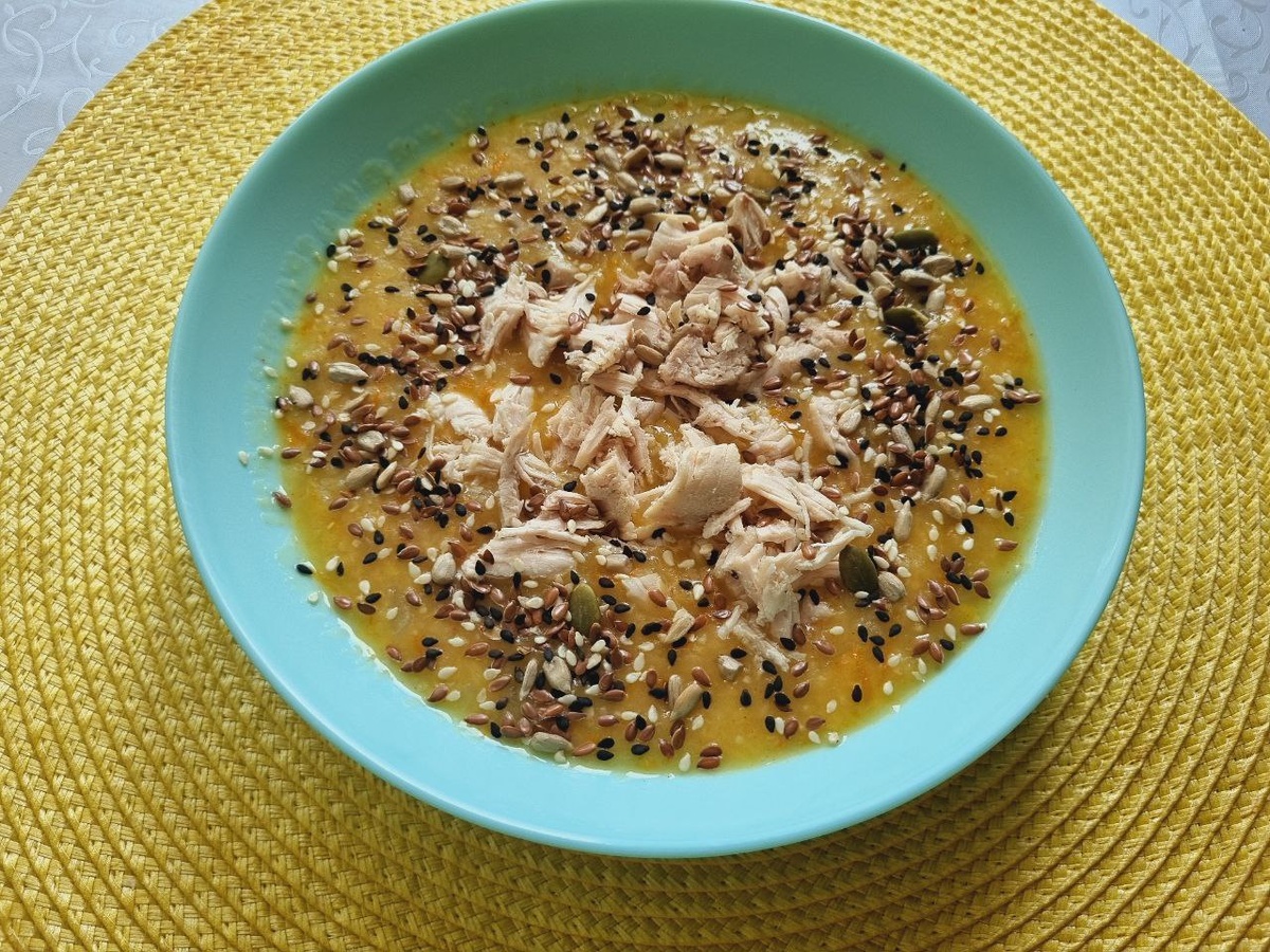 Разливаем в тарелки суп, режем каждому в тарелку мелкими кусочками куриное филе и посыпаем смесью семян.