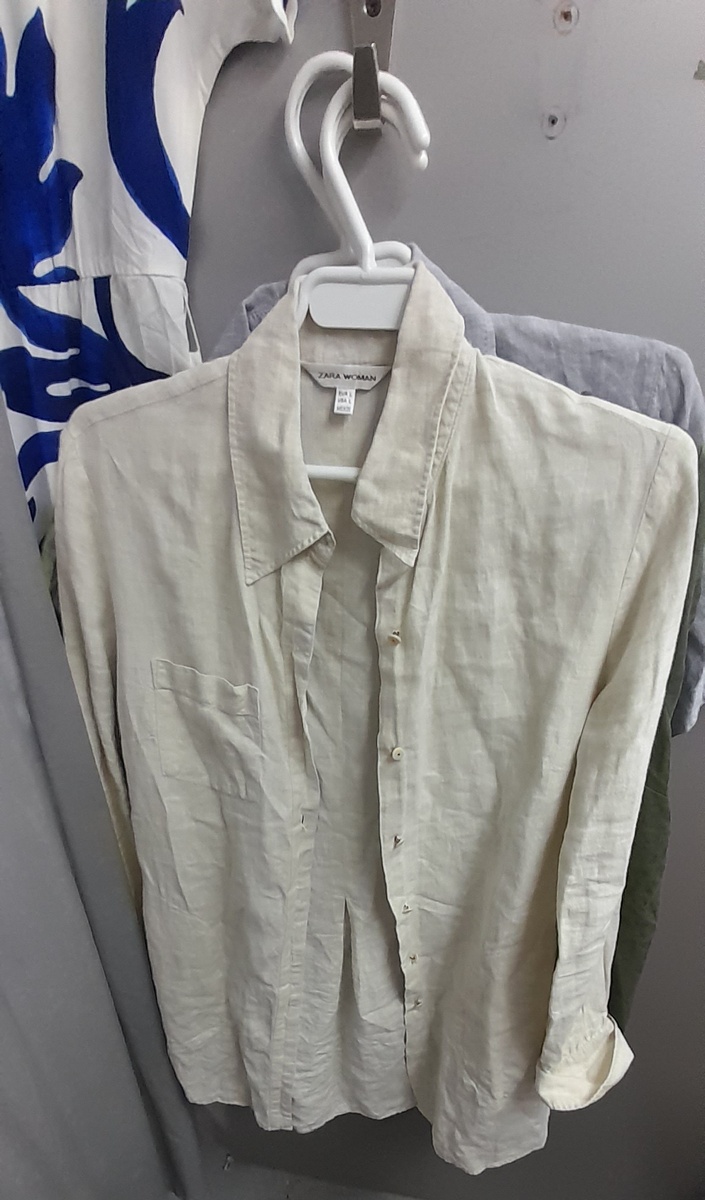 Приветствую всех любителей-секондоголиков на своём канале про примерки и покупки. В выходной заезжала в свой "околодомовский" секондхенд, посмотреть, какая там цена дня и что осталось после завоза, который был, когда я гостила у сестры. Цена за килограмм- 2490 рублей, это практически половина от завозной цены. Народа, на удивление, было много-и молодежи, и дам в расцвете красоты! Девченки копались в юбках-брюках,юноши-в футболках-рубашках. Скорее, из-за того, что это была суббота, вторая половина дня, народ и бродил в поисках чего-то эксклюзивного.В будни тут напода мало, если это не завоз и не большие скидки. Несмотря на это, мне тоже удалось найти неплохие вещи изо льна. Первая-длинная льняная рубашка от Зары в размере L.Мне сильно велика в плечах, да и не только. Просто на вешалке, конечно, не понятно, что это и как сядет на тебя. Сзади интересно застрочено по центру спинки. Большие накладные карманы. Не подошла по размеру никому, оставила в магазине. Вторая блуза тоже большого раз