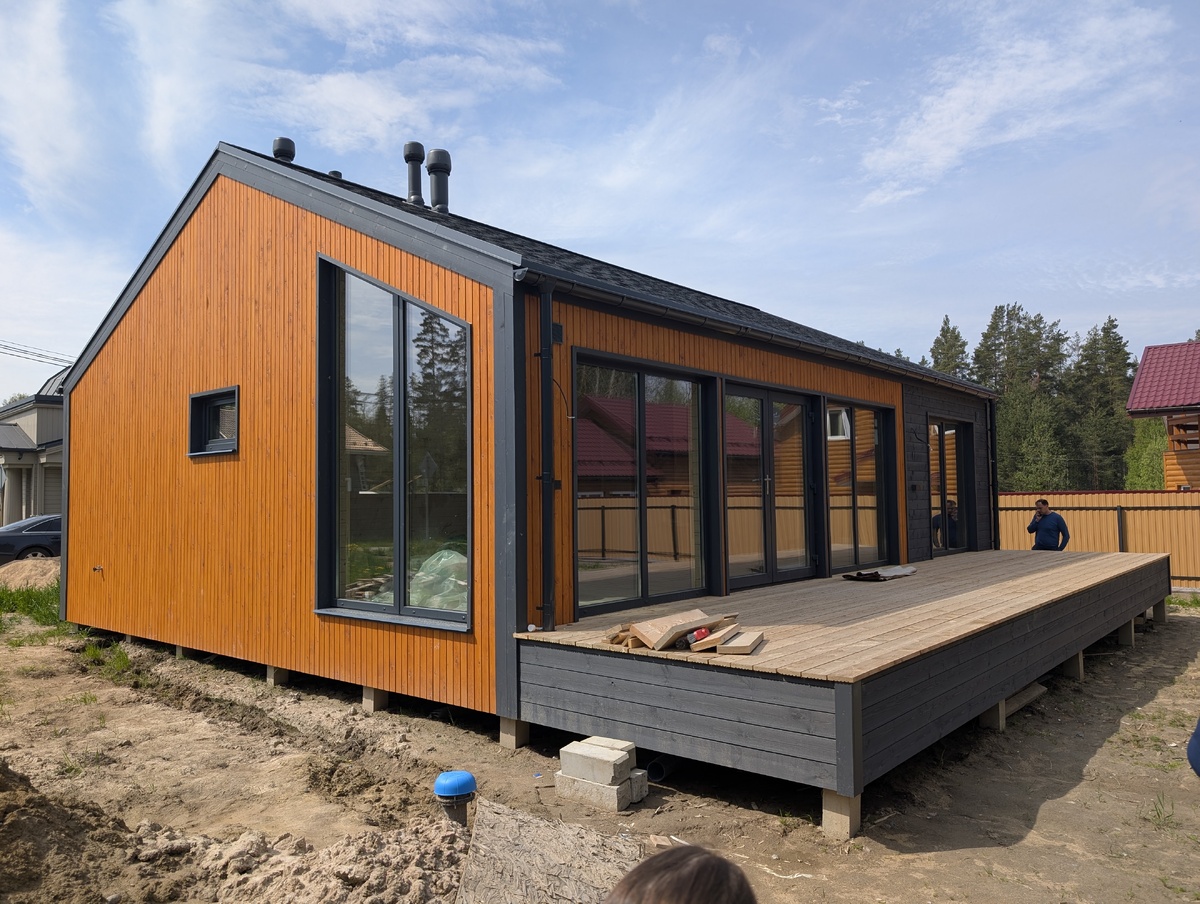 На днях мы побывали на севере Ленинградской области недалеко от деревни Ягодное. Это примерно 100 километров от Санкт-Петербурга. Места там очень живописные, вокруг хвойные леса, можно собирать грибы и ягоды. Рядом протекает река Вуокса и располагается озеро Суходольское. До Карелии рукой подать... Но нас интересует дом, построенный в этой локации. Выполнен он по классической каркасной технологии. Это значит что никаких новомодных сомнительных решений вроде несущих балок вместо клееных досок или использования гипсокартона вместо укосин. Фундамент на железобетонных сваях с увеличенным шагом и полусухая стяжка на полу обеспечивают идеальную жесткость конструкции. Никаких вибраций при ходьбе и идеально ровный пол. Перекрестное утепление 150+50, фасад отделан скандинавской доской, окрашенной на производстве, а внутренняя отделка выполнена широкой вагонкой, визуально неотличимой от имитации бруса. Отапливается дом электрическим котлом через водяной теплый пол, а не радиаторами. Это обеспе