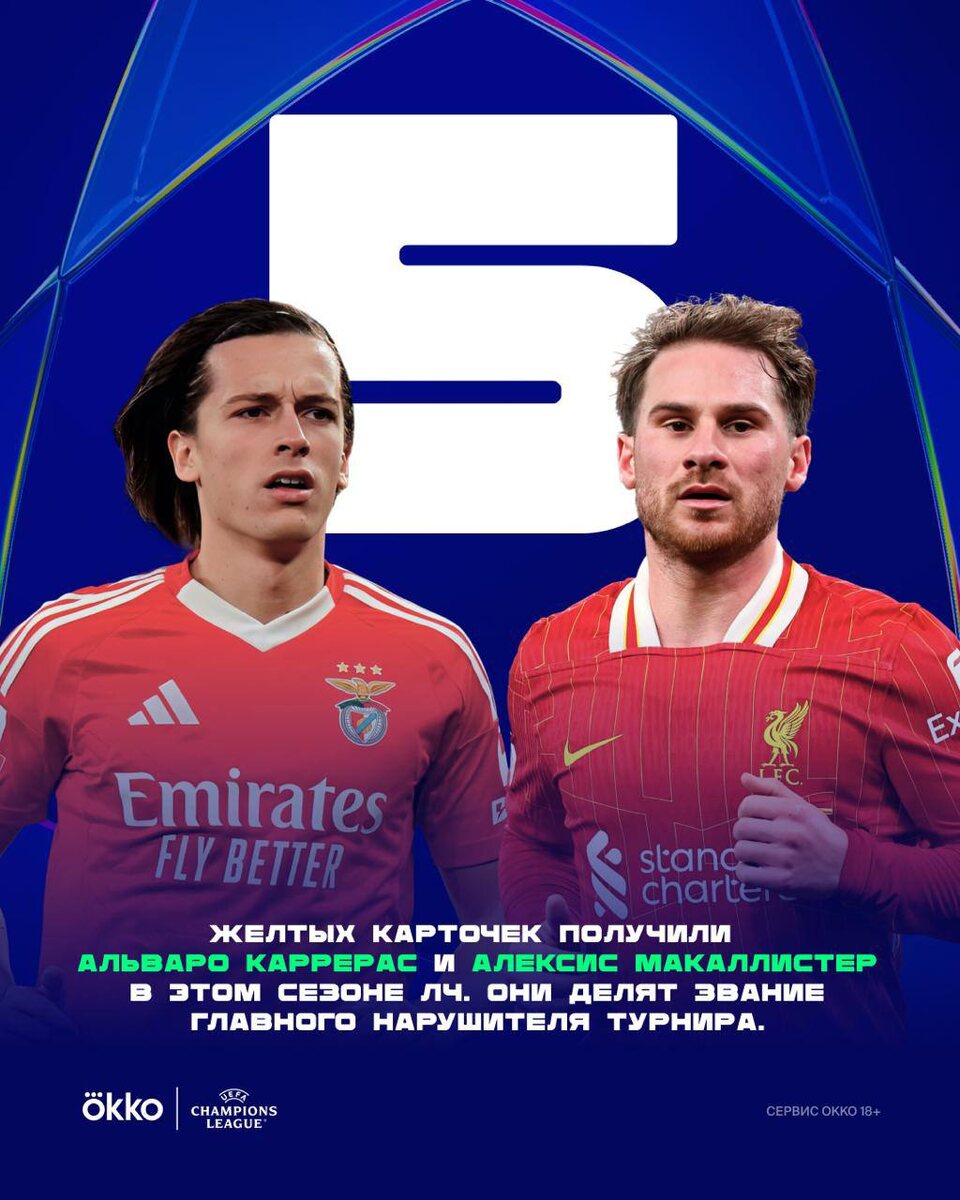 Всего лишь 5 дней до финала ЛЧ. Сегодня вспоминаем главных нарушителей турнира 😡 Первое место по желтым карточкам делят защитник «Бенфики» Каррерас и Мак Аллистер из «Ливерпуля». Грубияны.