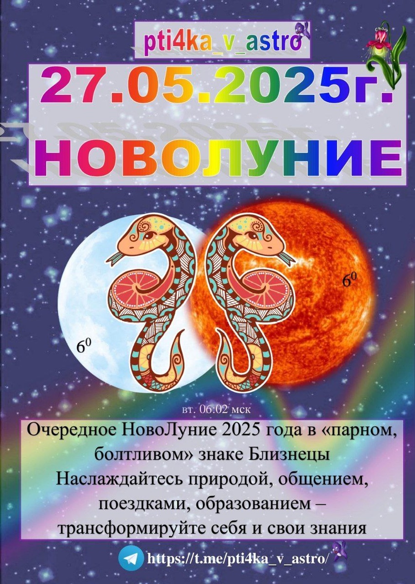 🧠 Эрудированное Новолуние ♊ Наступает 27.05.2025г. в 06:02 мск ☀️🌙 Солнце и Луна находятся в лёгком и подвижном знаке Близнецы ♊ ⚡ Близнецовская энергия направлена на сообразительность, общительность и информативность 📋 В это Новолуние важно прописать планы, связанные с взаимодействием с другими людьми, поездками и переездами А также с обучением и подготовкой документов 📝 Прописывайте планы в лёгкой и принудительной обстановке, в хорошем настроении и позитиве 🪷 По Ведическим традициям Солнце и Луна находятся в другом знаке - земном и практичном Тельце ♉ Все мечты приведут к стабильности и внутреннему комфорту 🛋️ Пропишите свои планы в уютном и комфортном месте Осознайте все, что действительно вам необходимо для своего внутреннего и душевного спокойствия Вам поможет денежная мантра 📝 Хорошее время для написания желаний весь день 27.05.2025 г. Денежные практики https://dzen.ru/media/id/5f31062d54d22d2496477f45/-denejnaia-praktika--v-novolunie-na-podokonnik-polojite-t