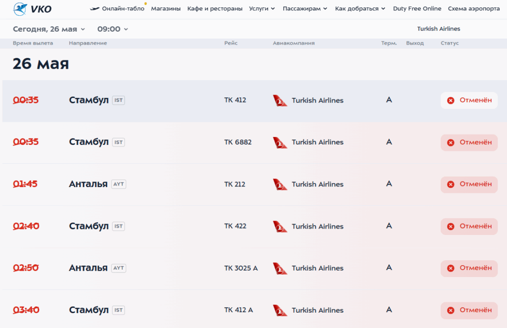 Вылеты в Турцию для туристов отложены до вторника из-за отмены рейсов Turkish Airlines Некоторым пассажирам все же удастся вылететь сегодня. Туристы, которые не смогли отправиться в Турцию ночью из Москвы и Санкт-Петербурга из-за отмены рейсов Turkish Airlines, с началом рабочей недели постепенно получают обновленную информацию о новых времени вылета — туроператоры переводят их на альтернативные рейсы. Однако для некоторых эта новость оказалась неприятной — им придется ждать вылета до вторника. Например, пассажиры рейса ТК3025 от 26 мая из Внуково получили перенос вылета на следующий день. Некоторым пассажирам того же рейса, назначенного на 25 мая, пришлось ждать более суток, но их пересадили на рейс ТК3171, который вылетает сегодня в 16:50. Пассажирам регулярного рейса ТК212 на 27 мая, который не был выполнен утром, назначен вылет в этот же день. В Санкт-Петербурге (Пулково) из-за отмен также происходят переносы на следующий день: «Моих пассажиров из Петербурга в Анталью сдвинули на с