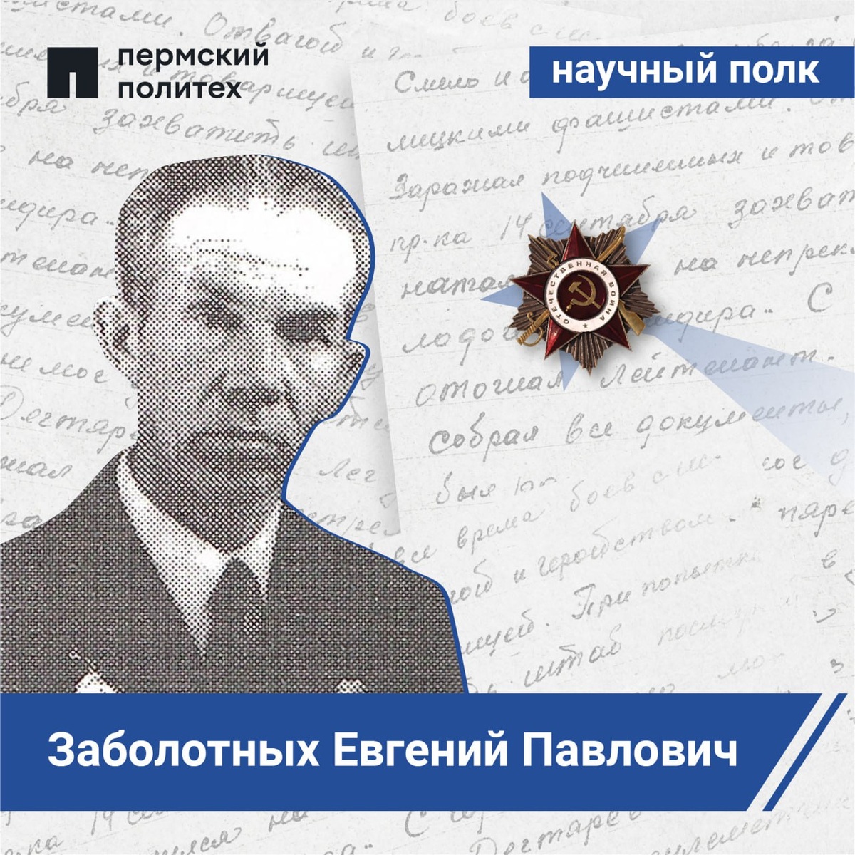 В этой рубрике мы рассказываем про ветеранов-фронтовиков и тружеников тыла — студентов, сотрудников и преподавателей Пермского Политеха, вставших на защиту нашей Родины в годы Великой Отечественной войны. Сегодняшний выпуск посвящен Евгению Павловичу Заболотных, учебному мастеру военной кафедры. Евгений Заболотных принимал участие в боях в составе 53-го гвардейского минометного полка в должности командира огневого взвода гвардейских минометов — знаменитых «Катюш». В скором времени он стал начальником разведки артиллерийского дивизиона. Ветеран также был задействован в операции по разгрому японских войск на Дальнем Востоке. Навсегда в его памяти остались преодоление крутых склонов Большого Хингана и последние залпы Второй мировой войны. Мужество и героизм Евгения Павловича отмечены орденами Отечественной войны, Красной Звезды, медалью «За победу над Германией» и другими наградами. В 1957 году капитан Евгений Заболотных уволился в запас. Вскоре фронтовик устроился на военную кафедру ПНИП