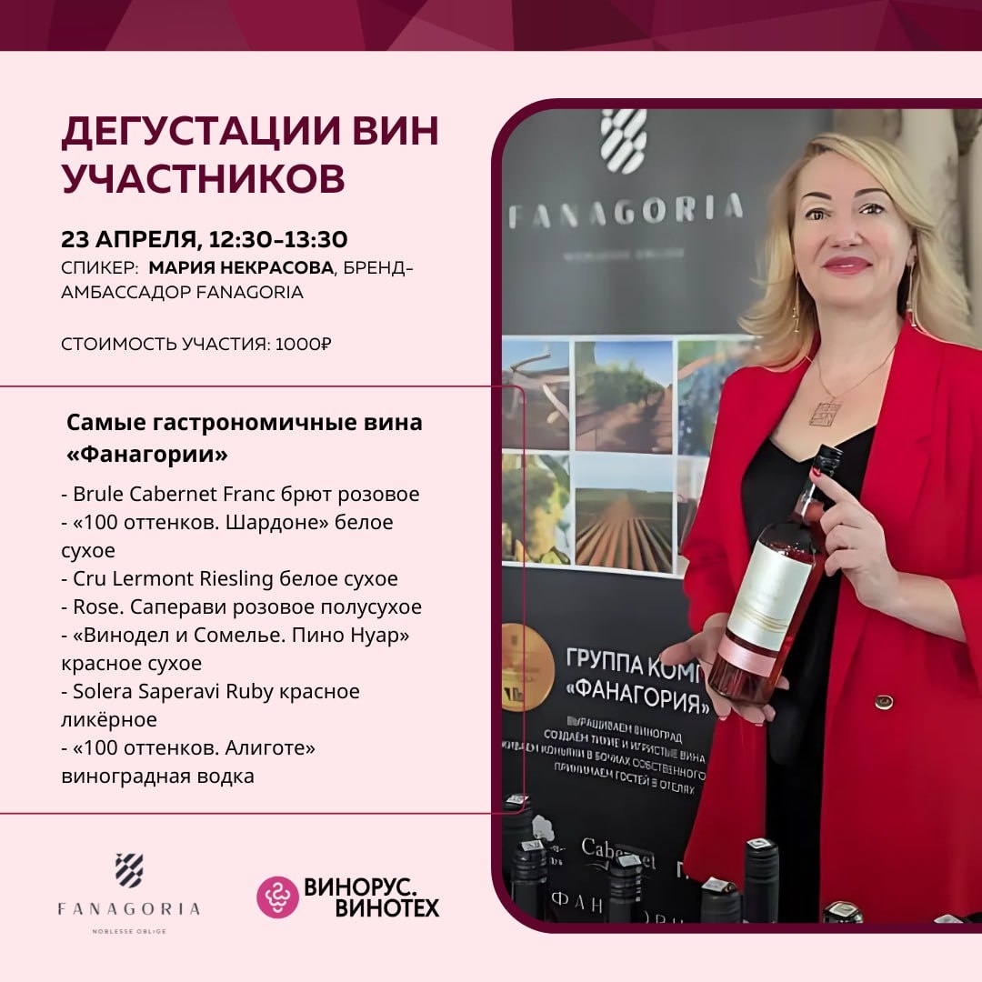 24 Π°ΠΏΡΠ΅Π»Ρ, 15:30β16:30 π£ ΠΠ°ΡΠΈΡ ΠΠ΅ΠΊΡΠ°ΡΠΎΠ²Π°, Π±ΡΠ΅Π½Π΄-Π°ΠΌΠ±Π°ΡΡΠ°Π΄ΠΎΡ Π²ΠΈΠ½ΠΎΠ΄Π΅Π»ΡΠ½ΠΈ Β«Π€Π°Π½Π°Π³ΠΎΡΠΈΡΒ» ΠΠΈΠ½Π° Π΄Π»Ρ Π΄Π΅Π³ΡΡΡΠ°ΡΠΈΠΈ: πΎ Brule Cabernet Franc Π±ΡΡΡ ΡΠΎΠ·ΠΎΠ²ΠΎΠ΅ π· Β«100 ΠΎΡΡΠ΅Π½ΠΊΠΎΠ². Π¨Π°ΡΠ΄ΠΎΠ½Π΅Β» Π±Π΅Π»ΠΎΠ΅ ΡΡΡ