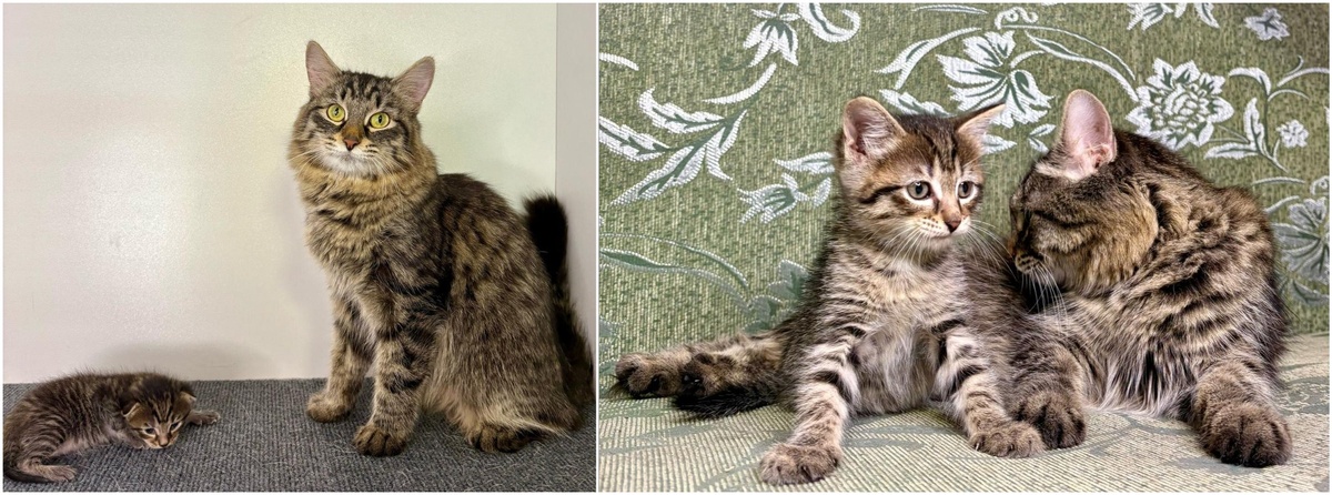 Правда промежуток между фото, конечно, не такой великий, по человеческим меркам, но по кошачьим очень даже достаточный. Первое фото сделано, в одноименной зоогостинице "Буся", в конце апреля, то есть, чуть больше месяца назад. Именно тогда мы и узнали, что беременная кошка родила прямо под открытым небом. Если вы не читали ее историю, то строчкой ниже, как раз статья о Бусе. После того, как Буся поселилась в одном из боксов гостиницы, за прошедший месяц, она успела побывать приемной мамой двум рыжикам, которых выкинули в мусорном мешке на улицу Ну а мы продолжим следовать этому тренду - "повтори семейное фото" :) Ведь в исполнении этой котосемьи, такие фото вызывают неудержимые положительные эмоции. Мега положительные!!! Так вот, рыжики быстро "влетели" семью, и почти так же быстро "улетели" по своим домам. Ну как быстро, относительно. Месяц они точно жили в гостинице. Спасибо большое Бусеньке, кормила и ухаживала за ними как за родными. А это фото уже из дома, слева девочка, справа