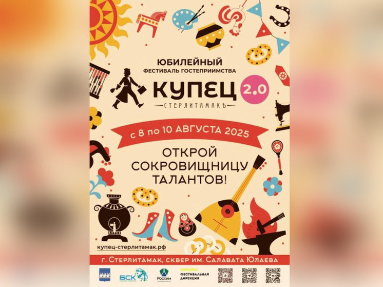 С 8 по 10 августа в Стерлитамаке в пятый раз состоится фестиваль гостеприимства «Купец 2.0», концепцией которого станет «Сокровищница талантов». Напомним, фестиваль получил две премии Russian Event Awards в 2022 и 2023 годах, а также включен в Национальный календарь событий России и список 65 лучших туристических мероприятий страны. На несколько дней Стерлитамак станет иммерсивным театральным городом – в программе народные песни, живая музыка, хороводы, интерактивные площадки, танцы и концерты. Основной площадкой станет сквер имени Салавата Юлаева, где разместятся торговые ряды, купеческие вывески, телеги и фотозоны в стиле XIX века.