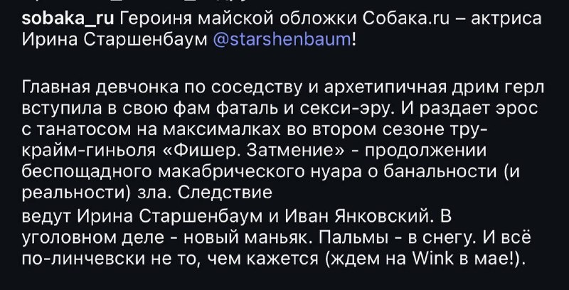 …архетипичная дрим герл вступила в свою фам фаталь и секси-эру. И раздает эрос с танатосом на максималках…тру-крайм-гиньоля...продолжении беспощадно макабрического нуара… пальмы – в снегу, и все по линчевски не то… …внутренний мейковер не обошелся без петербургского декаданса… Принесла вам очередное золотое сочинение из современных медиа, на этот раз постарался сотрудник Собака.ру Есть небольшие отличия между нельзяграмом и вк, но каждый из них делает мне больно. По отдельности я знаю каждое слово, но все вместе выглядит, как будто подросток украл телефон у мамы-сммщика и решил ее подставить. Помнится мне, что когда вышел ФЗ «О государственном языке Российской Федерации», там были пункты и про СМИ. Надо уточнить у профессионалов, насколько эта словесная экзекуция адекватна с юридической точки зрения. Но с филологической здесь страшна вырубай. Дефисы, конструкция предложения, скобки эти ненужные… Рассказывайте в коммах, что первым бросилось в глаза и сколько ошибок нашли