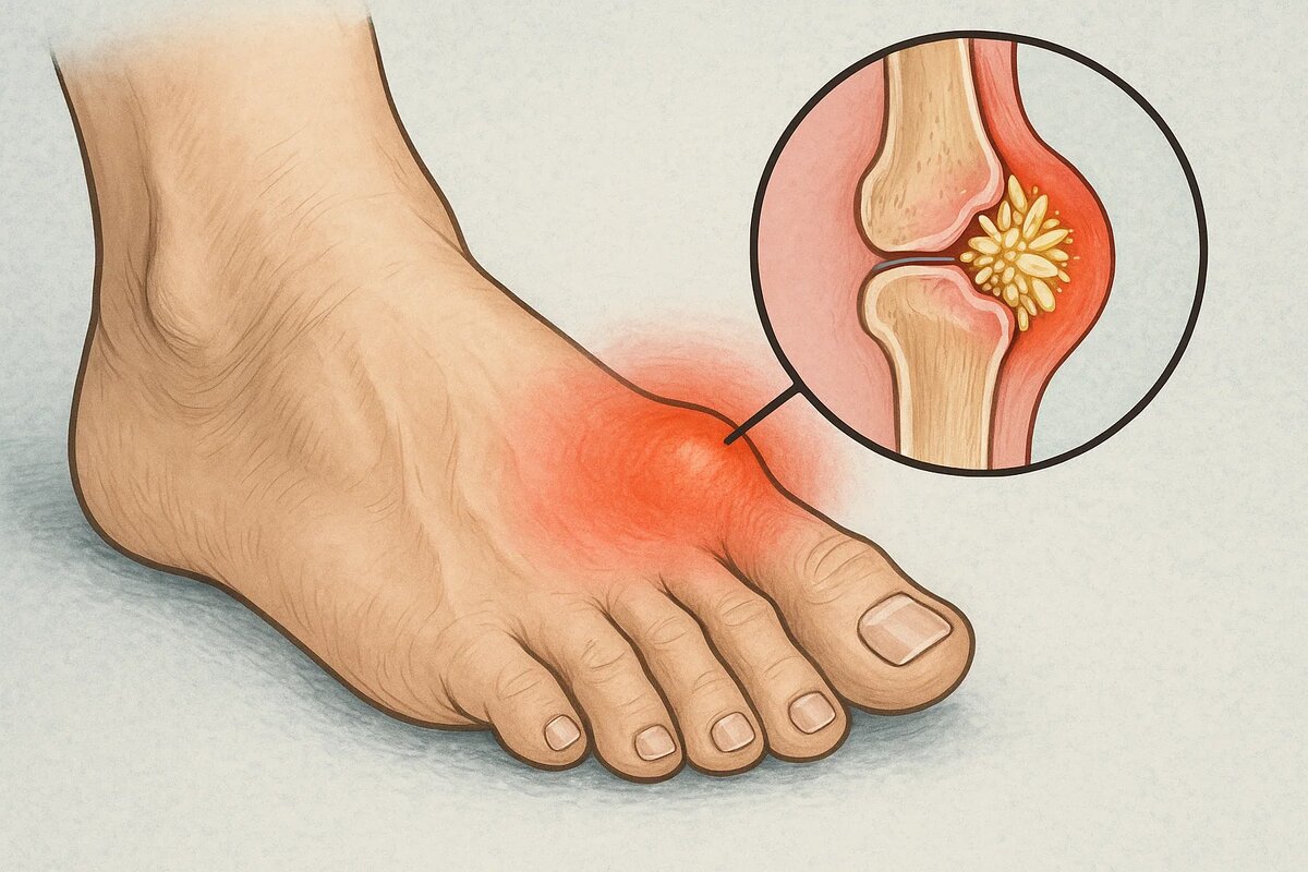 Классический признак подагры — острый артрит. Приступ обычно начинается внезапно, ночью или утром, с сильной боли в суставе, чаще всего в основании большого пальца ноги. Сустав краснеет, отекает, становится горячим и болезненным. Боль настолько интенсивная, что даже лёгкое прикосновение вызывает дискомфорт.