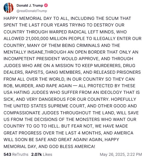 Donald Trump marks Memorial Day with a scathing attack on SCUM political opponents and judges who want the US to GO TO HELL But don't worry, MAGA