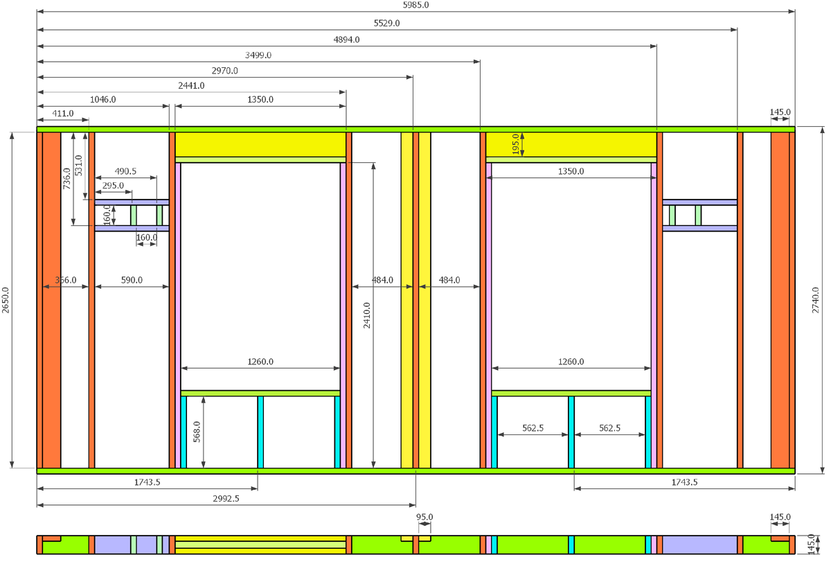 Завершив монтаж нижней обвязки стен: и построив удочку для подъёма стен: приступаю с сборке стеновых каркасов дачного одноэтажного дома 6х10. Из проекта дома в скетчапе распечатал себе схемы сборки каркасов с размерами: и приступил к сборке первой стены. Поскольку строить каркас я планирую в течение всего лета (у меня для этого только выходные и отпуск, минус дождливые дни), то я не стал сразу же нарезать стойки на весь каркас дома. Да, это было бы в целом быстрее, но, во-первых, мне негде хранить весь этот нарезанный материал, во-вторых, на стойки я выбираю самые ровные доски с минимумом сучков, остальные идут на лежни и перемычки. А снова перебирать весь этот штабель как-то не хочется: Поэтому нарезал стойки только на одну стену и разложил: Лежни (нижнюю и верхнюю обвязки каркаса) поставил рядом и сжал струбцинами, так как на лежни пошли доски покривее, чем на стойки: По лежням разметил положение стоек: А дальше призадумался над тем, как же именно вести сборку каркаса. Я строю такое